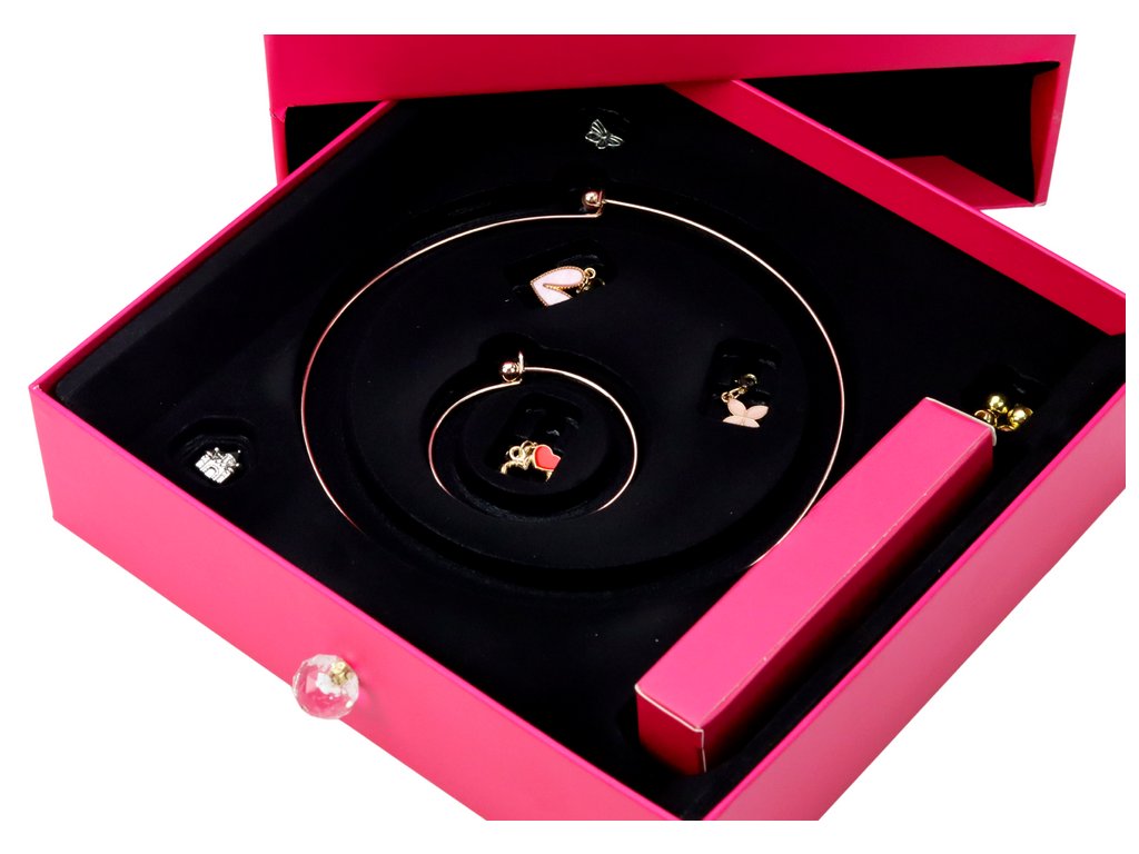 Na spodní poličce, kterou můžete vysunout, najdete růžový balíček s barevnými provázky, přívěsky a zlatým náhrdelníkem, který je ideálním základem pro zavěšení korálků a přívěsků a vytváří tak jedinečná a jedinečná umělecká díla.