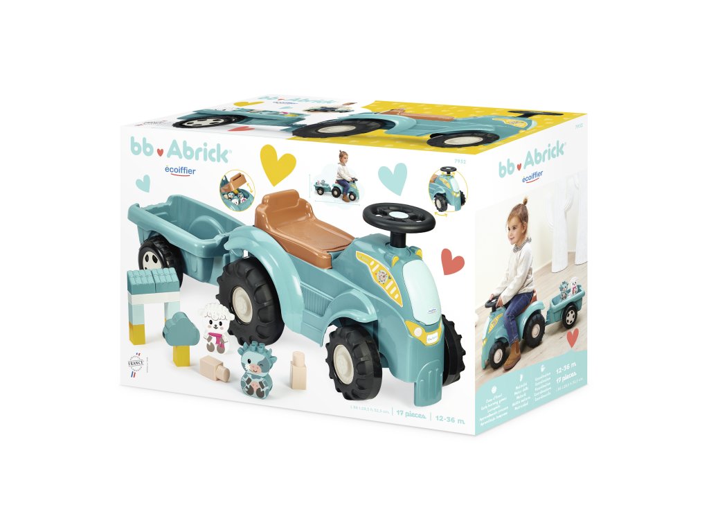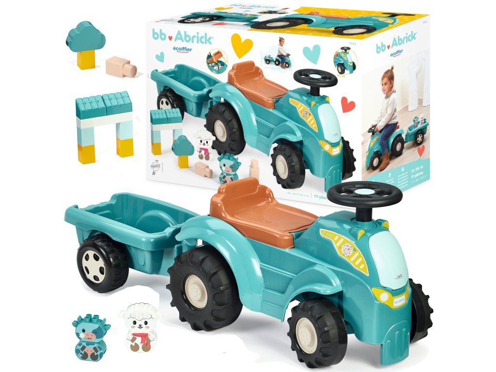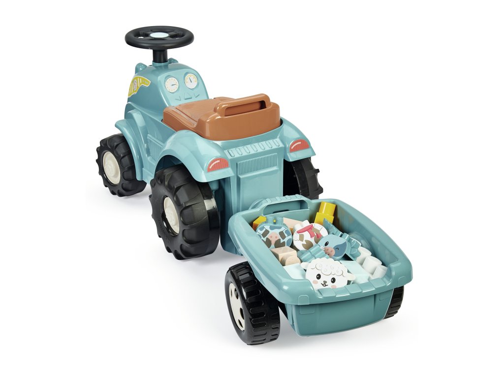 Sada obsahuje velké autíčko a 15 kostek , včetně 4, které po spojení vytvoří zvířátka - ovečku a krávu. Sada obsahuje traktor s přívěsem a stavebnice v různých tvarech.