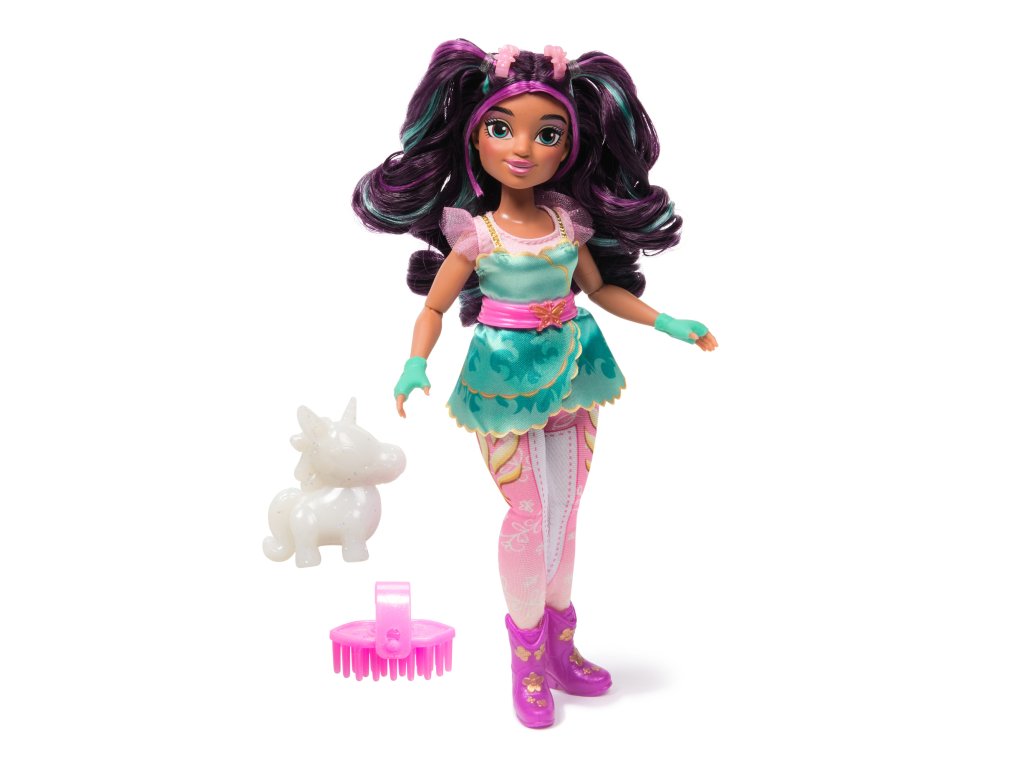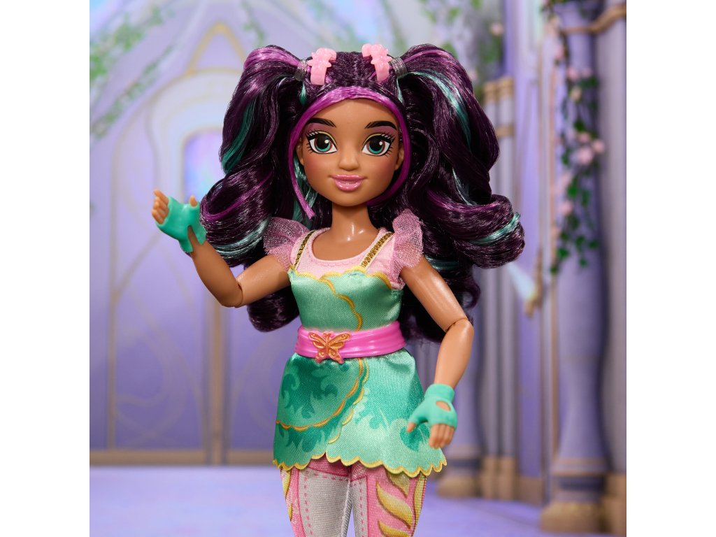 - Upravené vlasy: Panenka má jemné vlasy s barevnými pramínky, které lze kartáčovat a upravovat pomocí přiloženého stylingového doplňku.