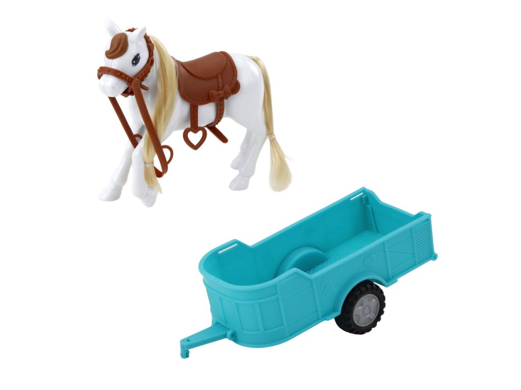 Auto s přívěsem je vyrobeno z odolného plastu a vyznačuje se moderním designem, který potěší každého malého nadšence do vozidel. Kůň je vybaven sedlem a otěžemi, díky čemuž je hra realističtější. Panenka v barevném oblečku skvěle doplňuje celý set a umožňuje vytvářet různé scény a příběhy.