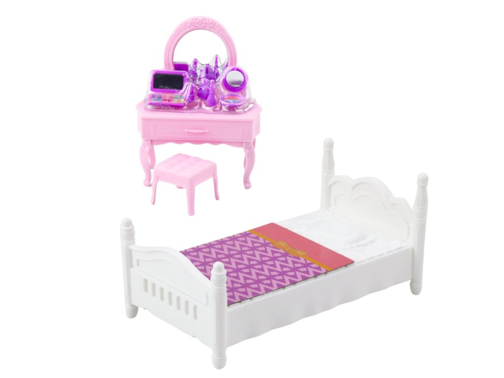 - Komponenty setu: panenka, postel s povlečením, toaletní stolek se zrcadlem, taburet, doplňky