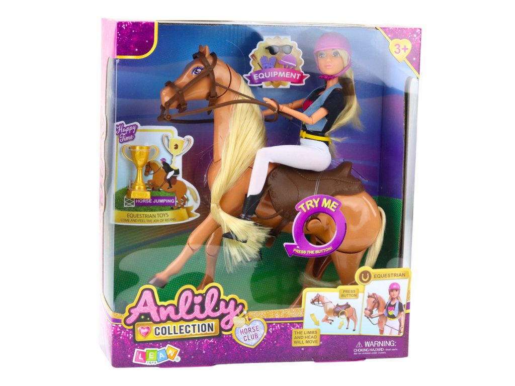 Panenka Anlily je oblečená jako skutečná žokejka - má na sobě speciální jezdecký obleček s růžovou ochrannou přilbou a vysokými jezdeckými botami. Její kůň je okouzlující hnědý oř s dlouhou hřívou a ocasem, který vypadá jako skutečný kůň z jezdeckých soutěží. Sada je vybavena sedlem a speciálním tlačítkem pro pohyb koňských končetin, díky čemuž je hra ještě realističtější.