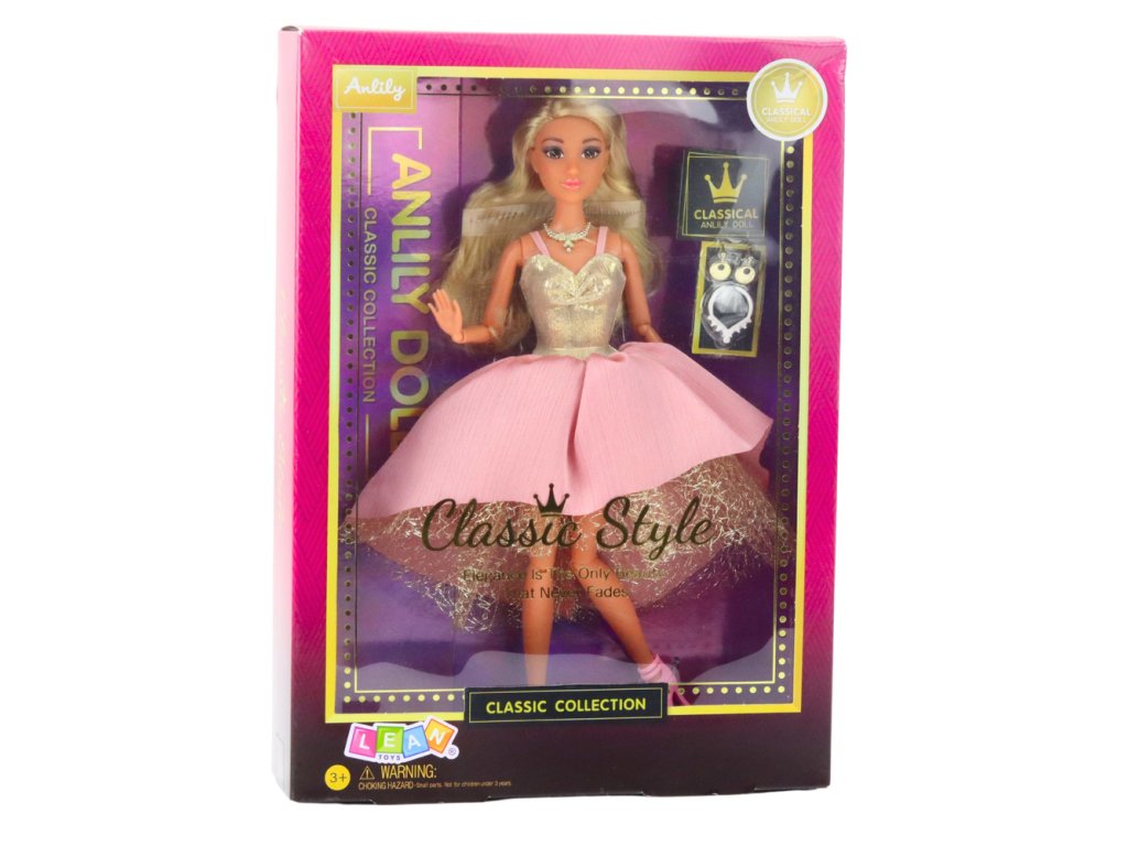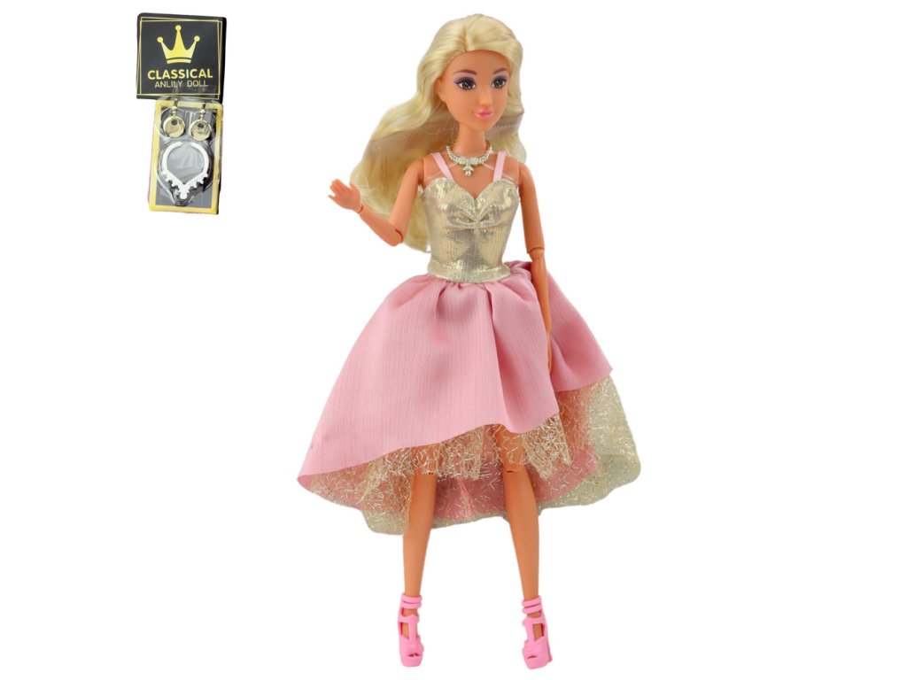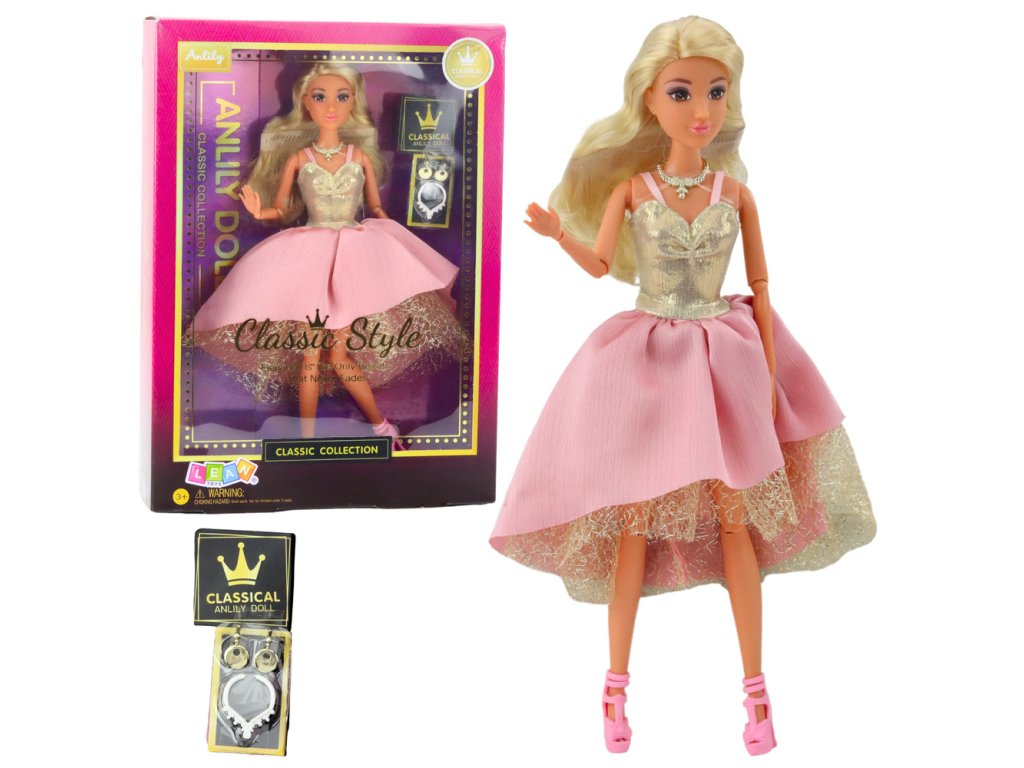 Tato panenka v elegantních plesových šatech je jedinečnou hračkou pro každou dívku, která sní o tom, že se stane princeznou, hvězdou plesu nebo parádnicí. Tato půvabná panenka, vysoká přibližně 30 cm, je oblečená v krásné, rozevláté róbě v pastelových barvách, zdobené zlatou krajkou. Její vzhled doplňují módní doplňky – náhrdelník, náušnice a elegantní boty – díky kterým vypadá jako pravá dáma připravená na speciální příležitost.