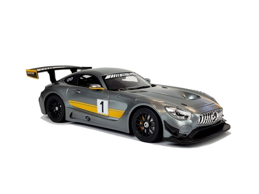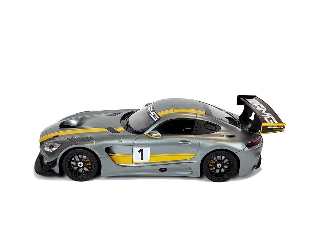 Pokud se chcete stát mistrem sportovního volantu, bude to pro vás ideální sada. Vynikající licenční rádiem řízený vůz Mercedes AMG GT3 v měřítku 1:14 . Model vyrobený v licenci Mercedesu byl reprodukován do nejmenších detailů. Je to velmi krásný a rychlý model. Jak karoserie, tak další detaily vozidla byly přesunuty do menšího měřítka. Na silnici působí silueta stroje lehce a dynamicky. Odpružené odpružení zajišťuje hladkou jízdu. Zábavu zvyšují svítící přední a zadní světla, která se rozsvěcují při pohybu. Tato multifunkční hračka při zábavě rozvíjí koordinaci a motoriku batolete. Praktické dálkové ovládání umožňuje řízení vpřed a vzad a také zatáčení doprava a doleva.