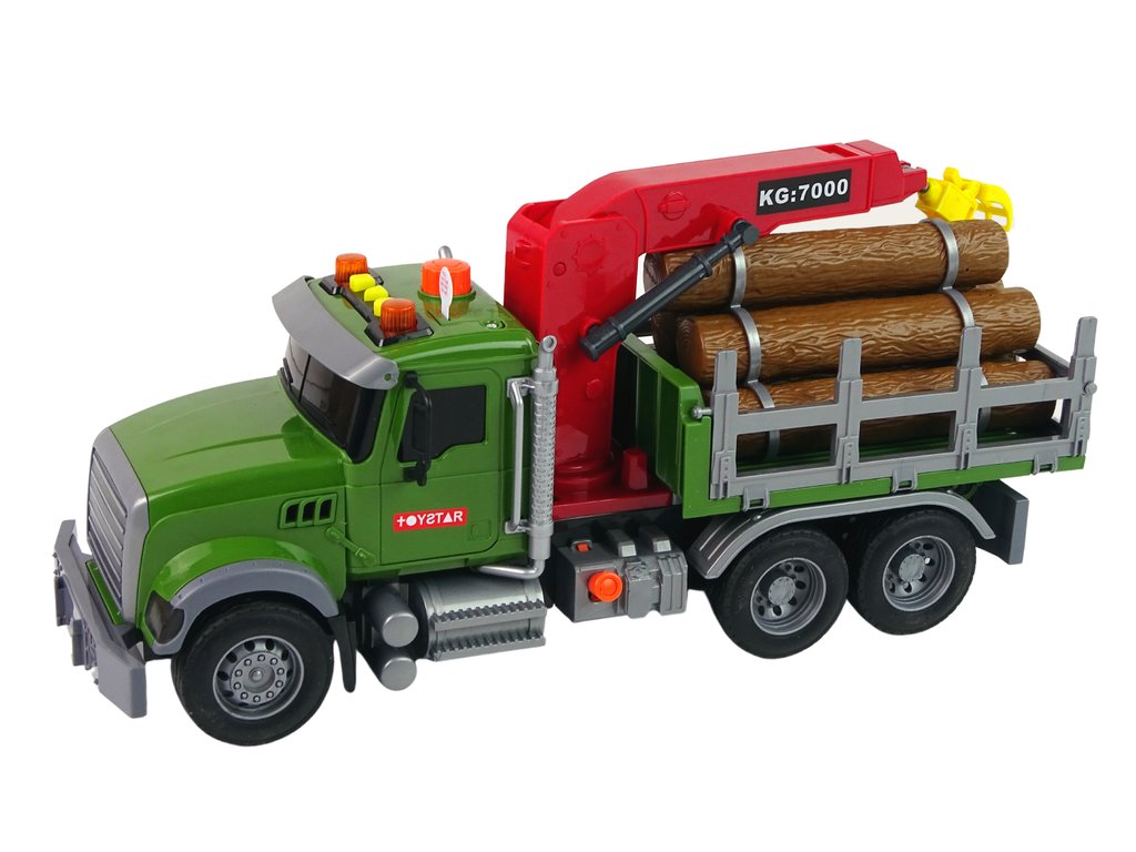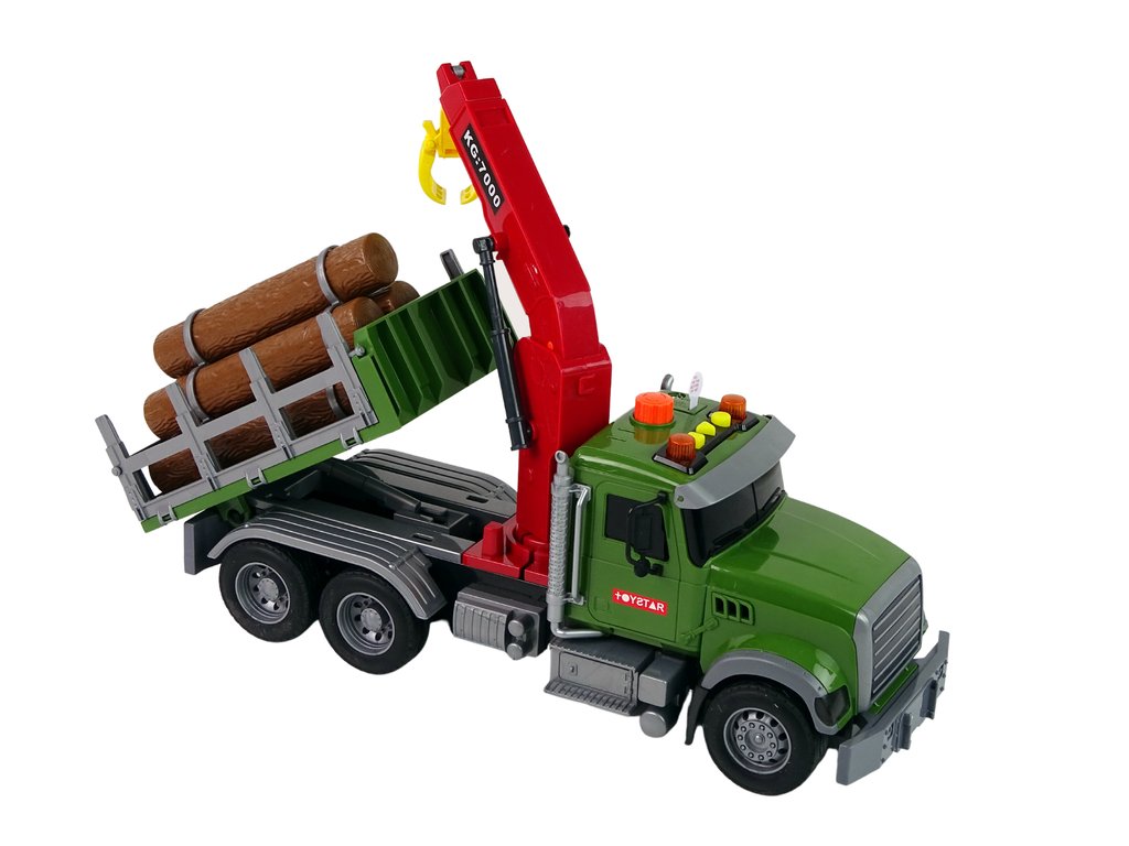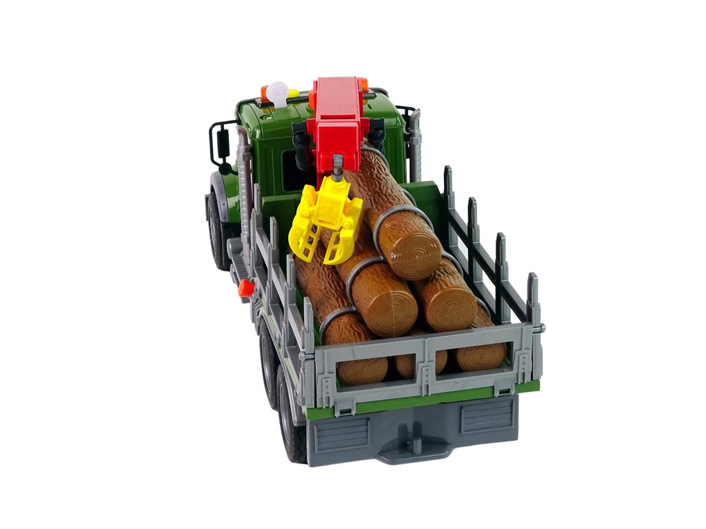 Přívěs vzadu má pojízdný jeřáb. Namontovaný na čtyřech kolech snadno převeze polena dřeva z lesa, ty jsou součástí sady. Do přívěsu lze naložit i další drobné hračky. Odvoz věcí z návěsu umožní namontovaný jeřáb. Vůz na vrchu kabiny má oranžové tlačítko, když ho párkrát stisknete, uvidíte jak, rameno jeřábu zvedá klády nahoru. Kdykoli budete chtít doplněk snížit, je úplně dole tlačítko pro stisknutí.