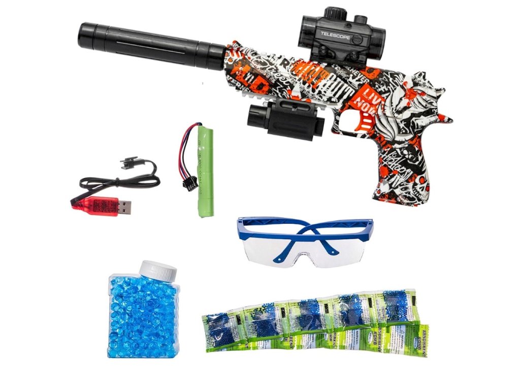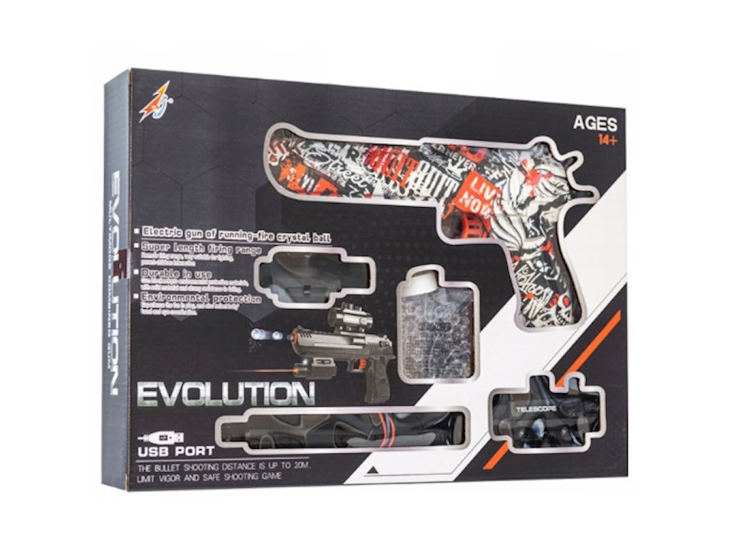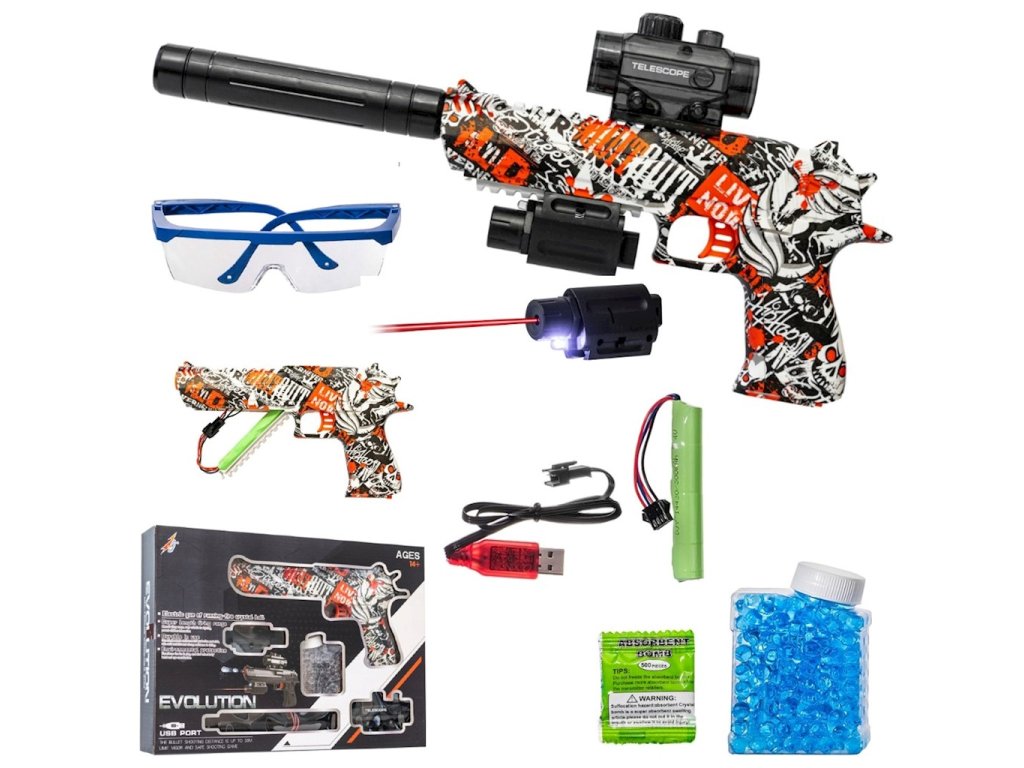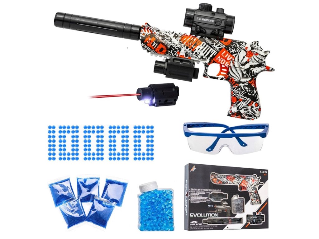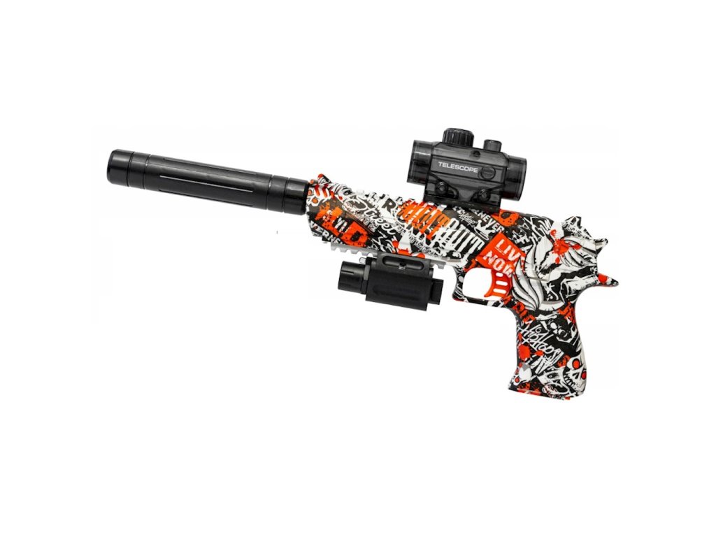Řada gelových kuličkových pistolí představuje nový rozměr ve hře automatických odpalovacích zařízení s bezpečnou municí. Je to skutečná mánie, která ovládla svět! Měkké bezpečnostní gelové kuličkové pistole jsou přesnější než vystřelovače pěnových šipek nebo kuliček. Vzhledem k vysoké rychlosti vystřelovaných kuliček a jejich velikosti - cca 7/8 mm, je určena starším dětem než pistole s pěnovou municí.Automatická pistole DesertEagle QML 226 bílá s černo-červenou grafikou na gelové kuličky.