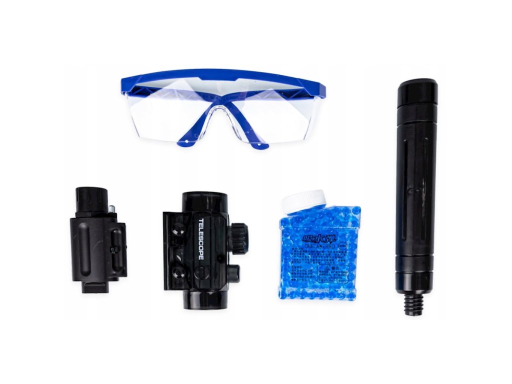 přiložený zaměřovač, který je zároveň zásobníkem na gelové kuličky,