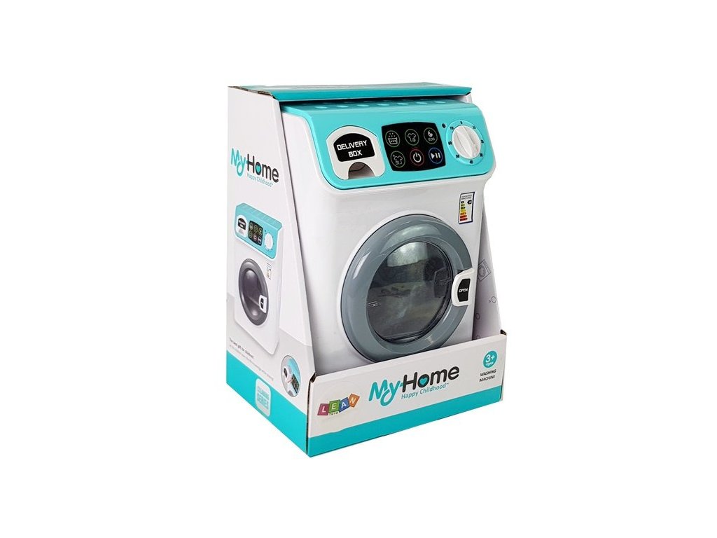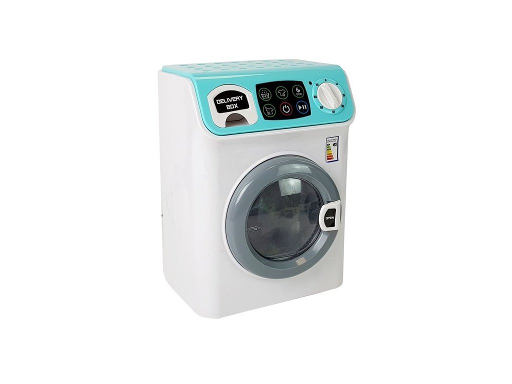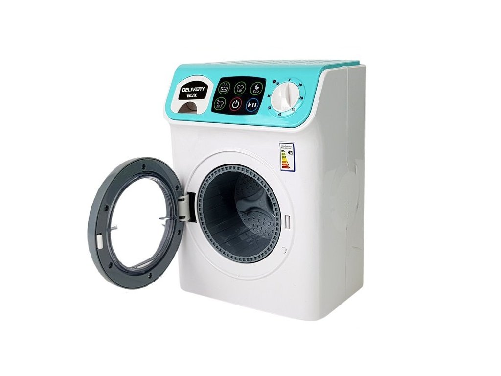 Pračka z kvalitního plastu, v pěkných bílých a mintových barvách a samolepkách. Pračka má otevírací buben a výsuvnou zásuvku na prací prostředek. Po zavření dvířek se automaticky spustí a buben se začne točit. Motor vydává hluk, když pračka běží. Funguje jako skutečný! Má samolepku s dotykovým panelem pro nastavení programů. Stačí nastavit program, otočit pohyblivým knoflíkem s svítící diodou pro nastavení teploty, obléknout oblečení a je hotovo. Bavte se !