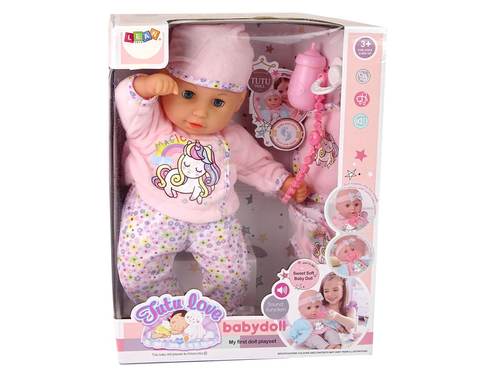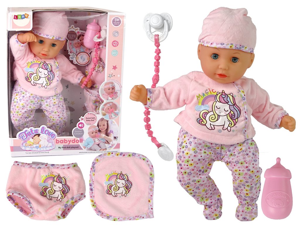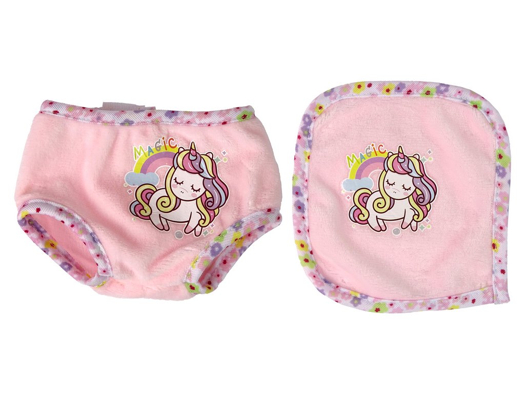 Panenka je oblečená v krásném růžovém květovaném pyžamu s krásným jednorožcem uprostřed. Na hlavě bobra je plášť. Sada je dodávána s figurínou a lahví na pití v růžové barvě, dále s bryndákem a kalhotkami s jednorožcem. Celá sada do sebe perfektně ladí a vypadá přímo rozkošně. Panenka má pohyblivé ruce a nohy a hlavu. Může být umístěna vsedě i vleže. Oblečení je odnímatelné, což vám umožní změnit šatník.