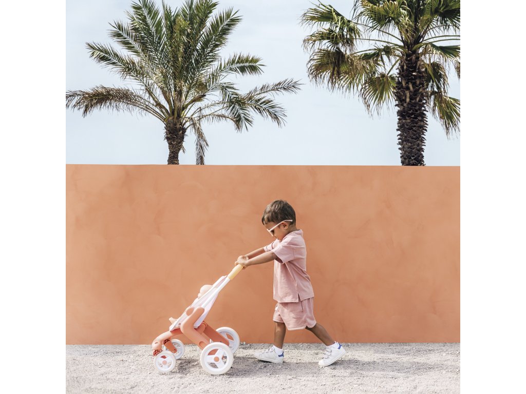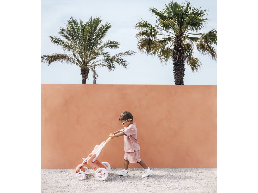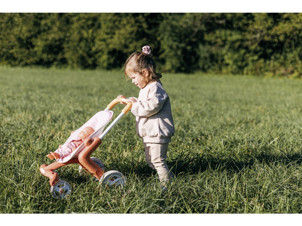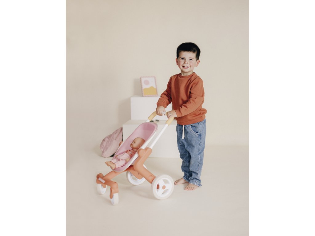 Kočárek je k dispozici v tlumených barvách : bílý a oranžový rám, světle růžové sedadlo. Má ocelový rám a pohodlnou rukojeť , takže je vhodný pro děti starší 18 měsíců. Materiál je měkký na dotek a snadno se čistí .
