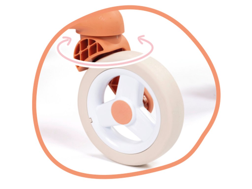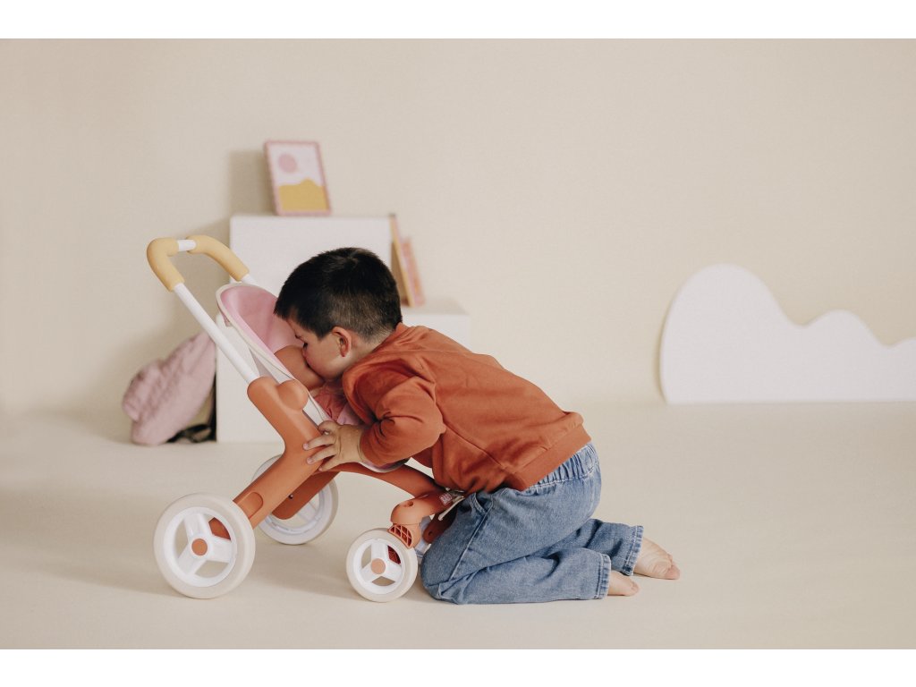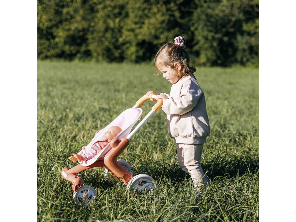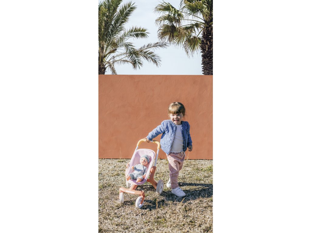 Kočárek je k dispozici v tlumených barvách : bílý a oranžový rám, světle růžové sedadlo. Má ocelový rám a pohodlnou rukojeť , takže je vhodný pro děti starší 18 měsíců. Materiál je měkký na dotek a snadno se čistí .