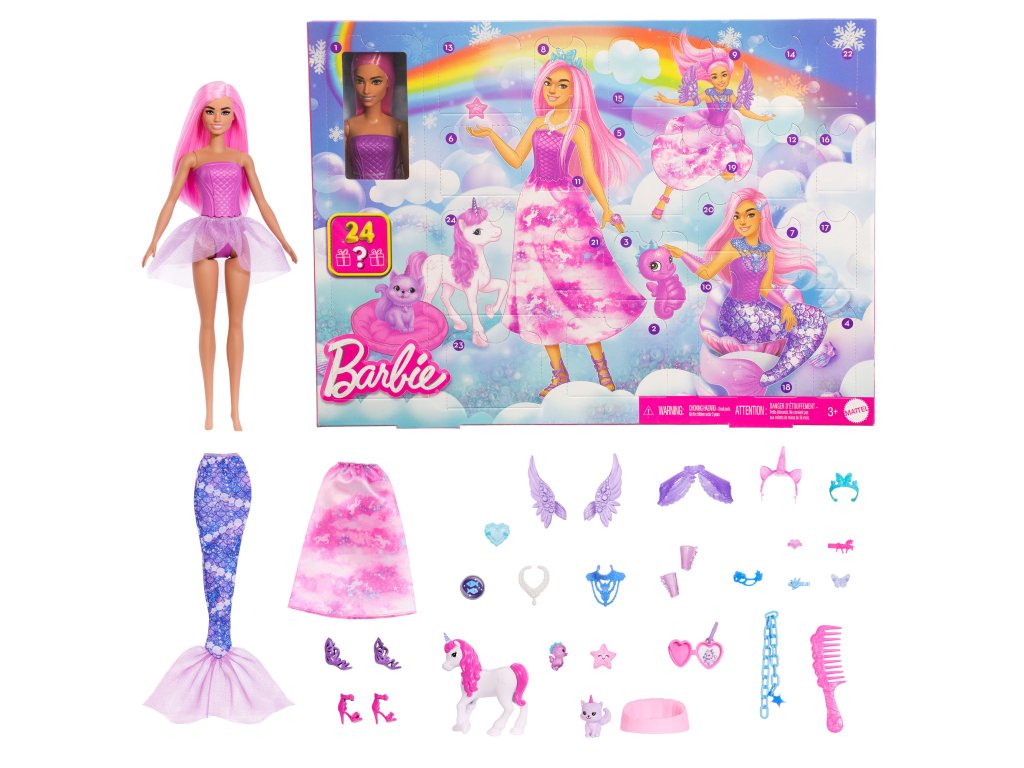 Odpočítávejte do Vánoc pohádkovým způsobem s adventním kalendářem Barbie! Každý den čeká nové překvapení, které dětem přiblíží kouzelný duch prázdnin. První den se v okně objeví panenka Barbie s dlouhými růžovými vlasy a v následujících dnech: oblečení, zvířata a doplňky , které vám umožní proměnit Barbie v mořskou pannu, princeznu nebo vílu . Tato jedinečná sada spojuje radost z prázdninového očekávání s hodinami kreativní hry.