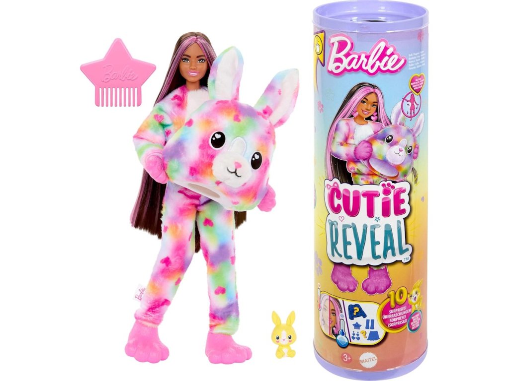 Panenka Barbie Cutie Reveal Colorful Bunny HRK38V sérii Barbie Cutie Reveal Colorful Dreams objevíte módní panenku Barbie ve zvířecím kostýmu, rozkošné mini zvířátko, módu, doplňky a fantastická překvapení, jako je změna barvy. Jak vypadá vaše panenka? Sejměte kostým a odhalte pohyblivou panenku Barbie s dlouhými, barevně melírovanými vlasy. Hlava kostýmu se promění v neuvěřitelně měkkou postel pro mini zvířátko – ideální místo pro spánek. Jaká rozkošná zábava!