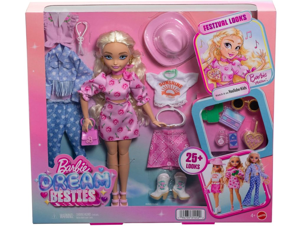 Připravte se na nezapomenutelný festivalový zážitek s Barbie "Malibu" Dream Besties Festival Stylings! Tato módní panenka s dlouhými blond vlasy a jemným make-upem je inspirována nejnovějšími trendy na hudebních akcích. Díky široké škále vyměnitelných oděvů a doplňků mohou děti vytvářet odvážné, barevné styly, které zdůrazní individuální charakter Barbie.