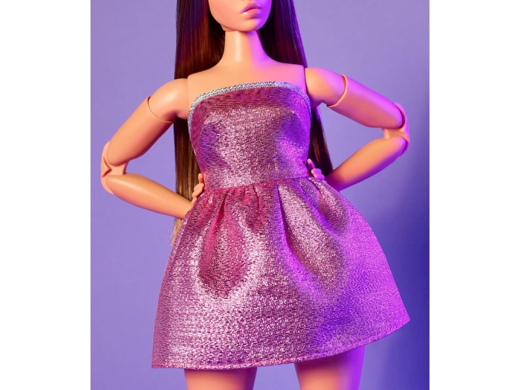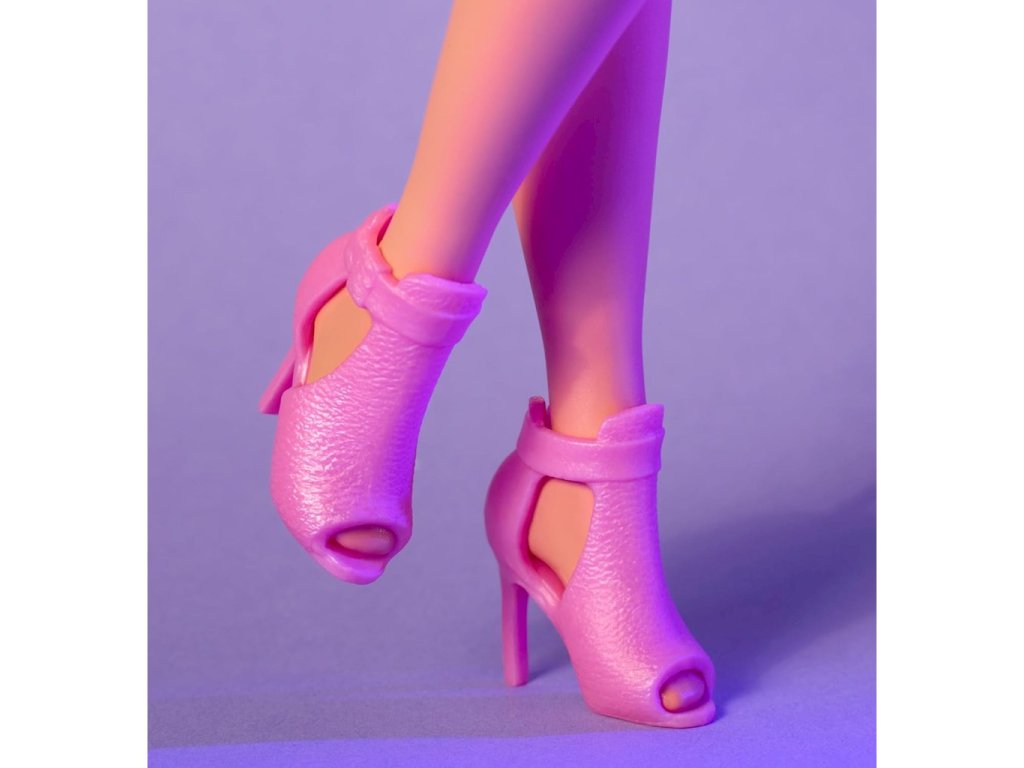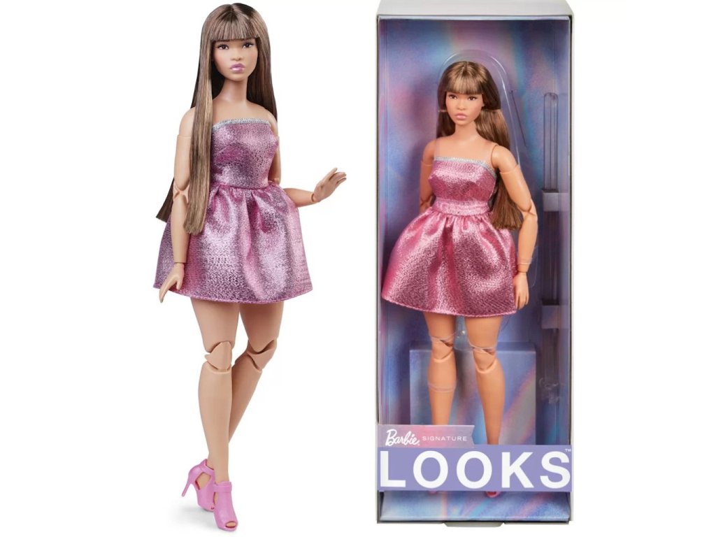 • 24 panenek v řadě Barbie Looks nosí třpytivé růžové šaty bez ramínek rozšířená sukně a lesklé, odhalené boty na vysokém podpatku prsty