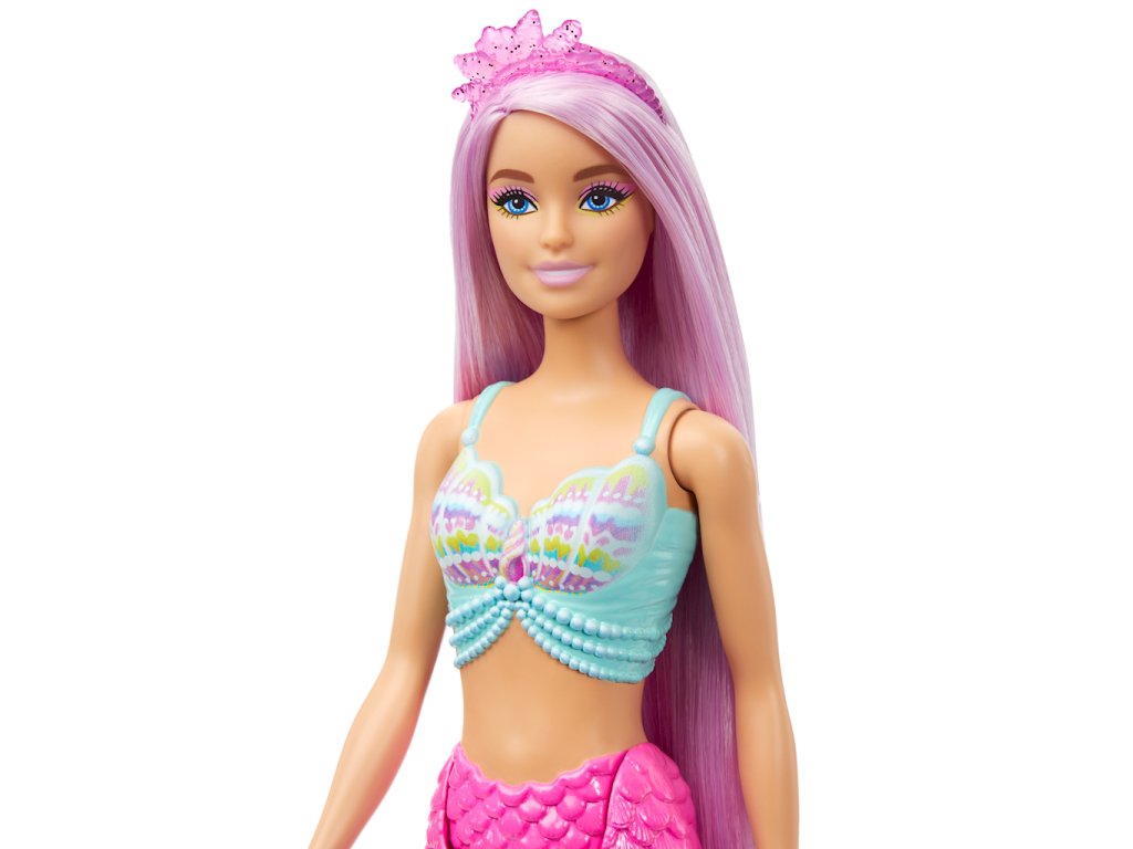 • Panenka Barbie mořská panna nosí krásně zdobený živůtek z mušle a růžový ocas s ploutvemi ombre.