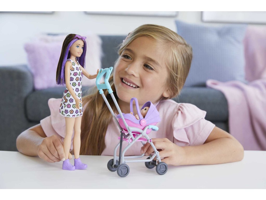 Sada dále obsahuje doplňky nezbytné pro každodenní péči: měkkou přikrývku, lahvičku, chrastítko a rozkošného plyšového medvídka . Skipper nosí pohodlné páskové šaty a boty, ideální pro její pečovatelskou roli. Sada povzbuzuje děti k vytváření vlastních příběhů, rozvíjí jejich fantazii, učí péči o druhé a podněcuje kreativitu.