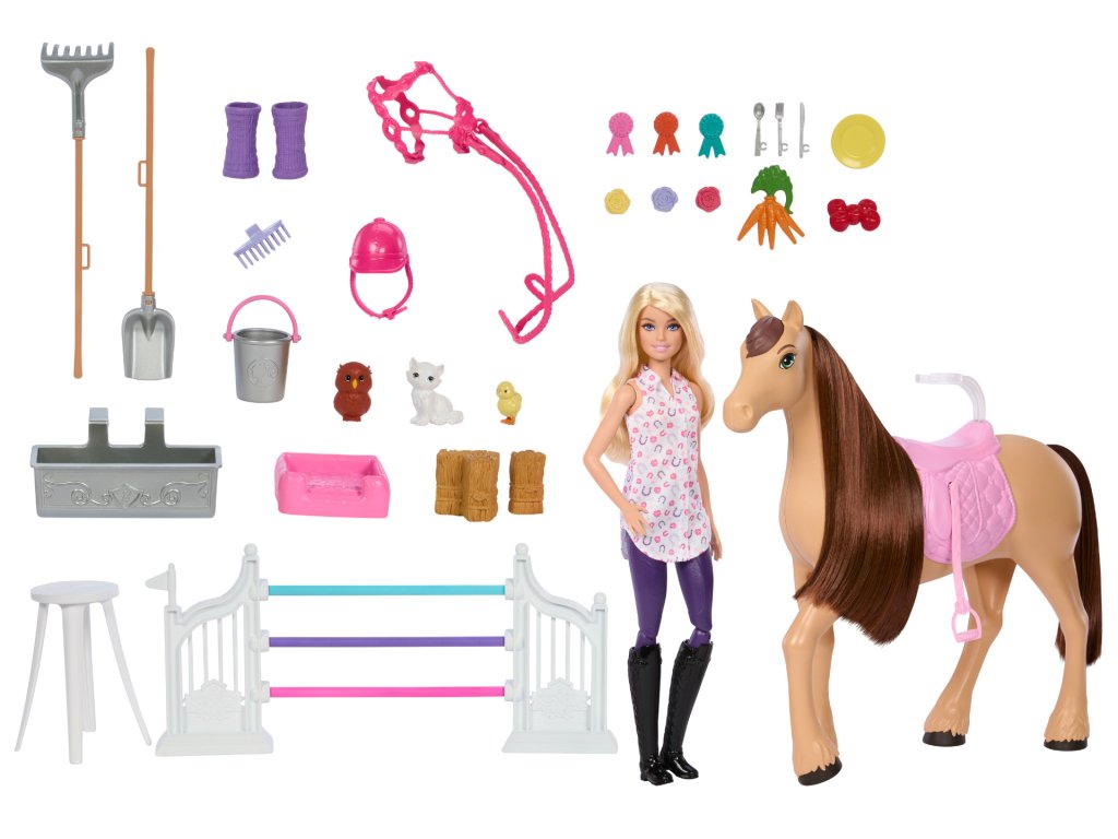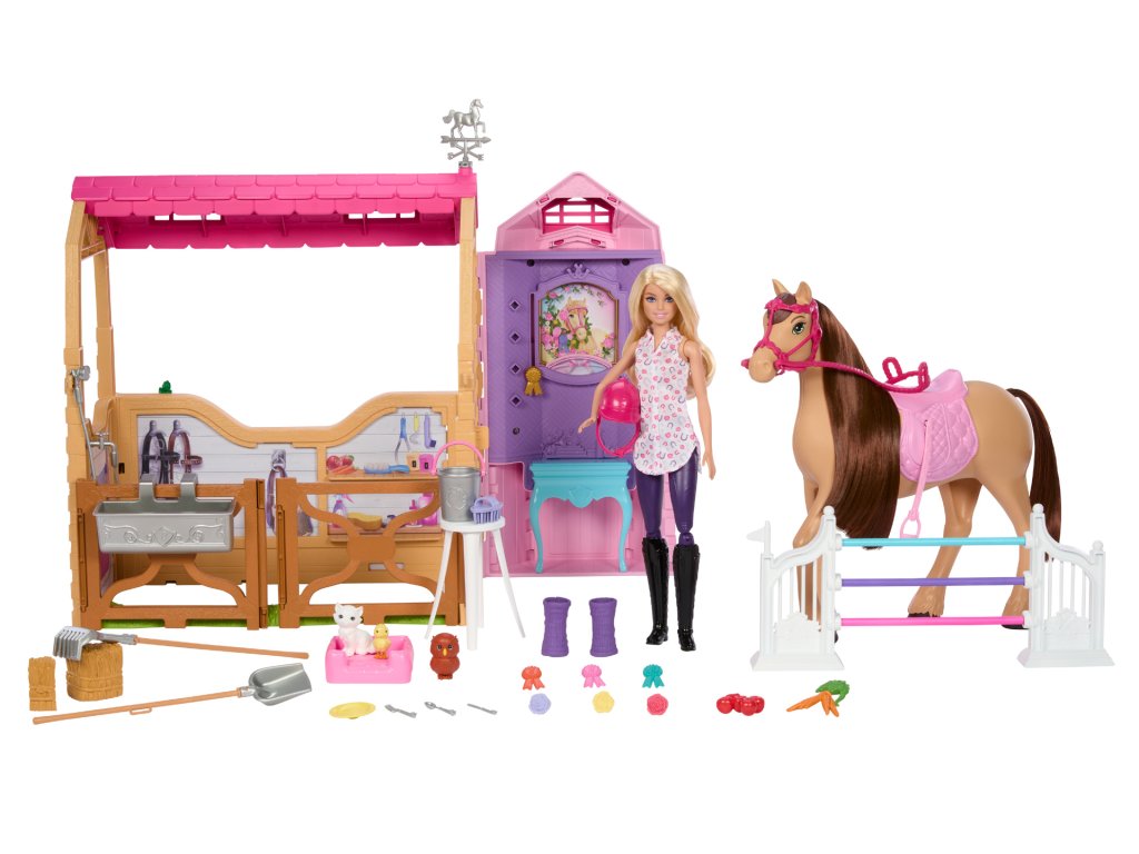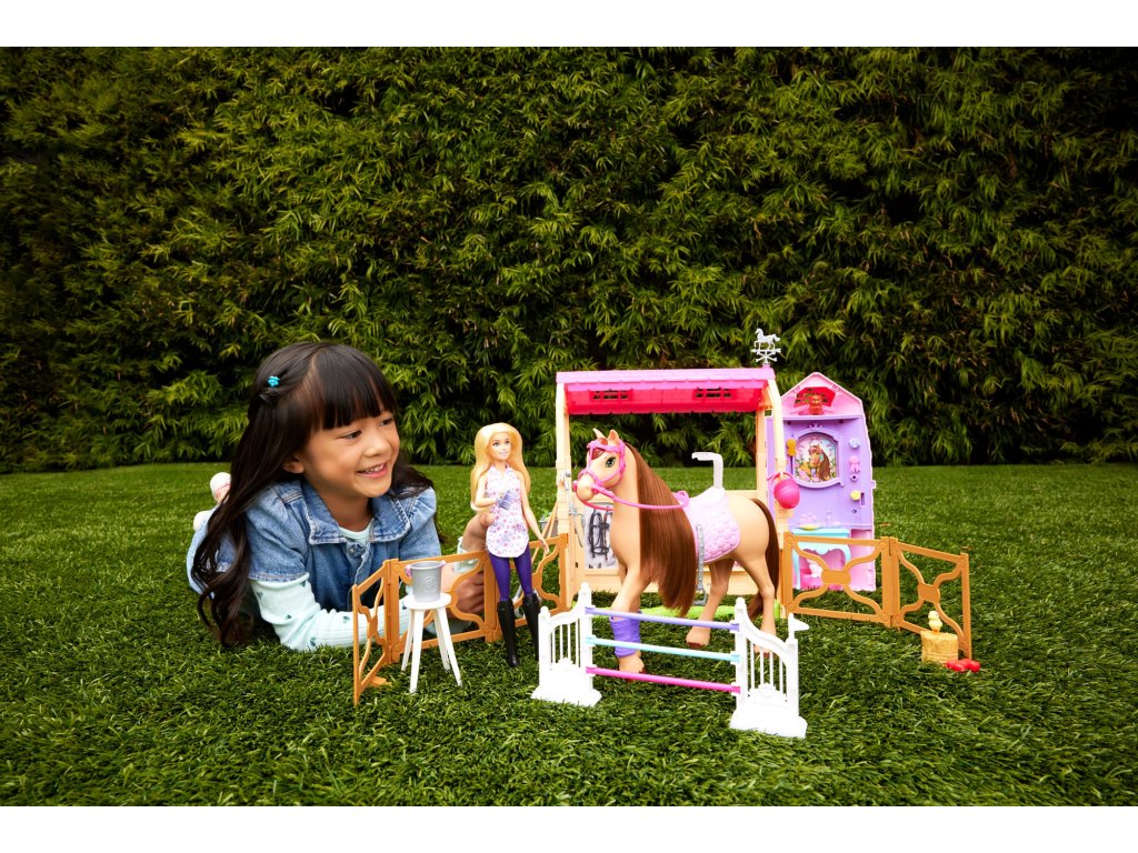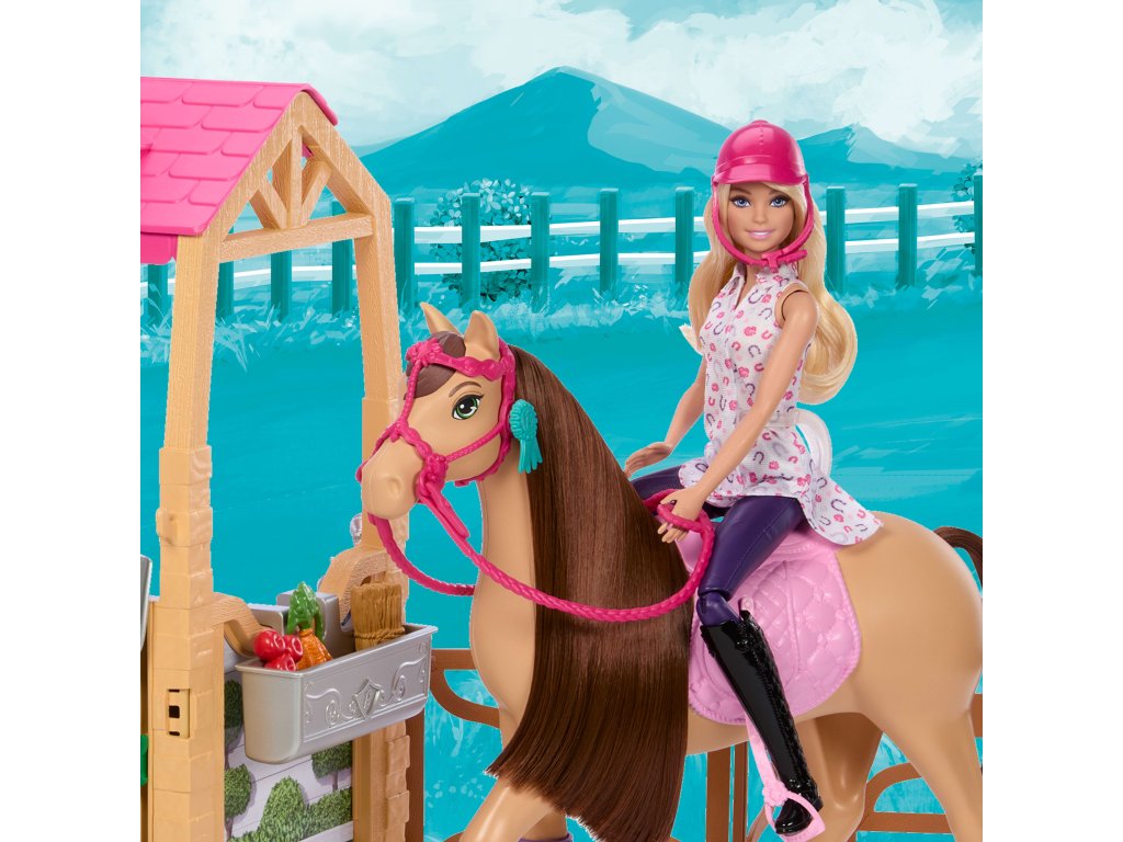Sada obsahuje 6 herních zón . V krmné stanici může Barbie krmit svého koně barevnou „zeleninou“, kartáčovat jeho hebkou hřívu a ocas v oblasti stříhání a trénovat velkolepé skoky u plotu. Pověste stuhy nebo fotografie na zeď vítězů a vytvořte pohádkovou atmosféru v zahradě plné růží. K dispozici jsou také příslušenství pro čištění stáje, jako jsou hrábě, lopata a seno .