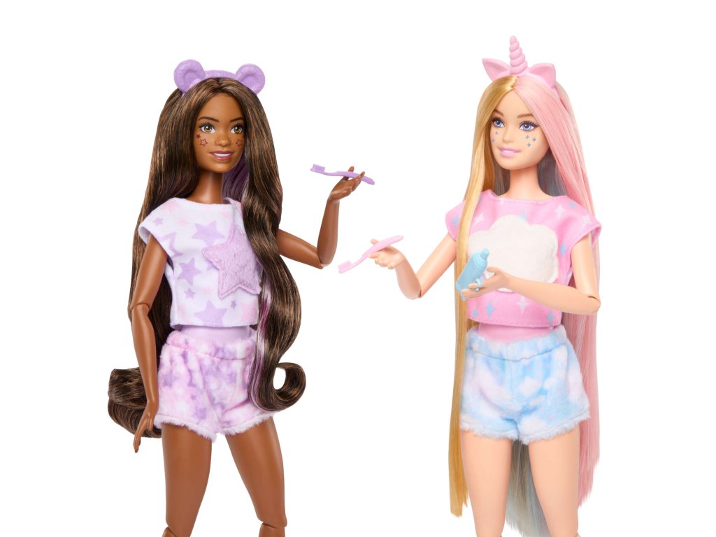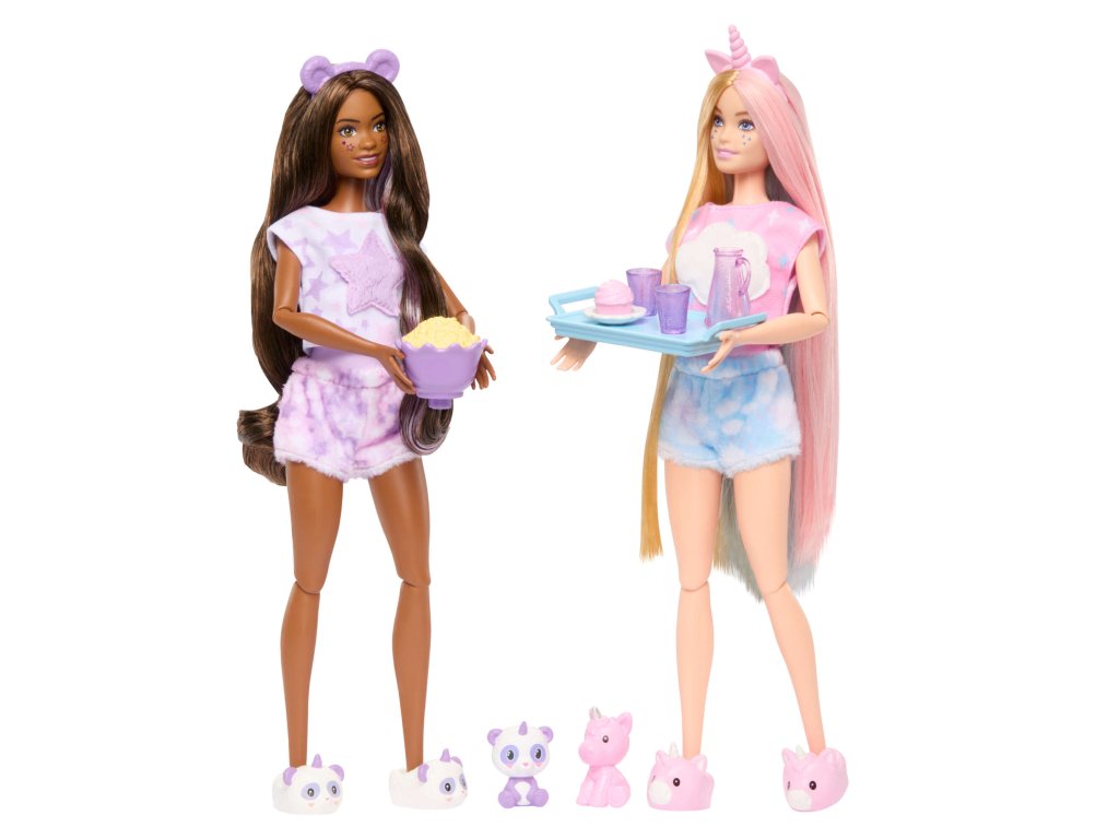- v ceně: 2 panenky Barbie Cutie Reveal v pyžamu (tričku a šortkách) ukryté ve spacím pytli a kostýmu zvířecí hlavy, 2 mini zvířátka se změnou barvy, 2 páry pantoflí, 2 gumičky do vlasů, 2 froté, 1 tác, 1 kbelík popcornu, 2 muffiny, 1 džbánek, 2 šálky zubní kartáčky, 1 "zubní pasta", 2 pleťové masky, 1 hřeben a 2 spacáky pro domácí mazlíčky