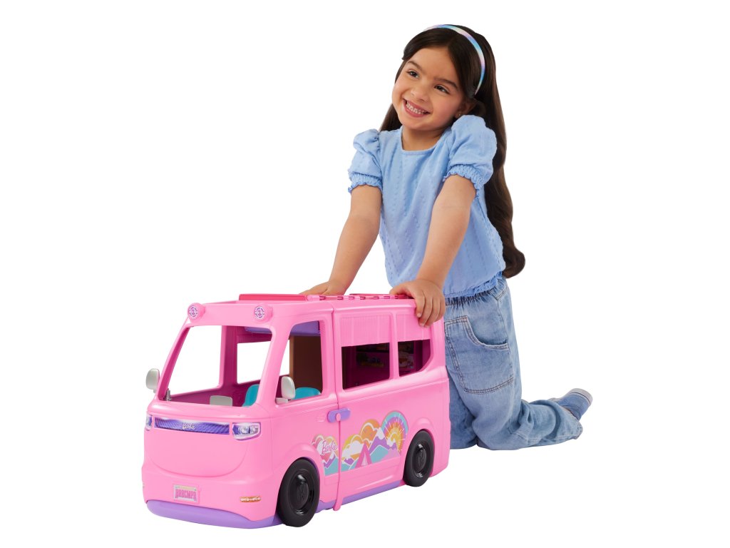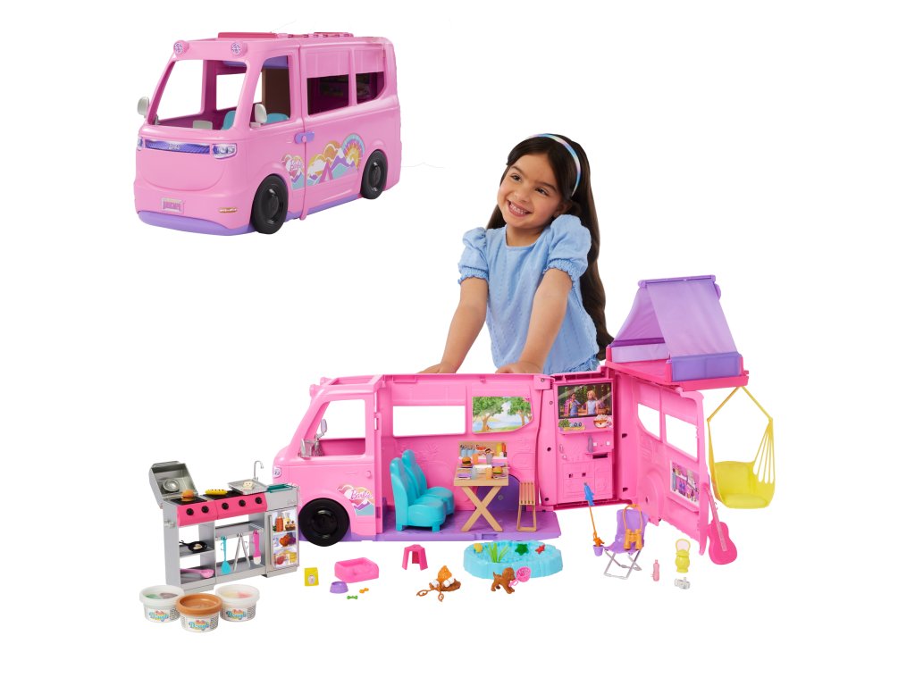 Vydejte se na nezapomenutelné dobrodružství s Barbie Dream Camper - jedinečným vozidlem a sadou 2 v 1, která dětem otevírá svět kreativních venkovních her. Tento velký růžový karavan obsahuje 7 herních zón a více než 60 doplňků , které vám umožní hrát nekonečné příběhy plné dobrodružství.