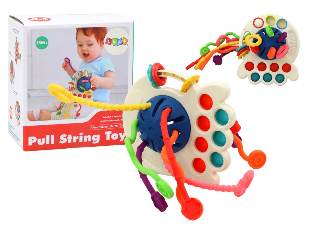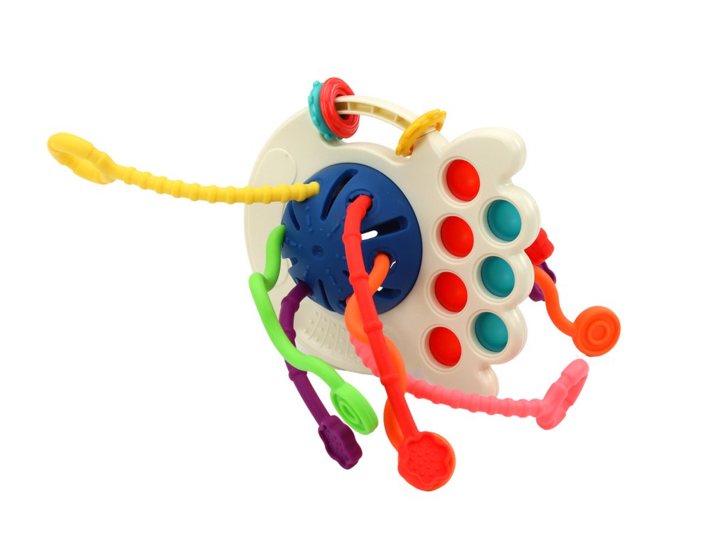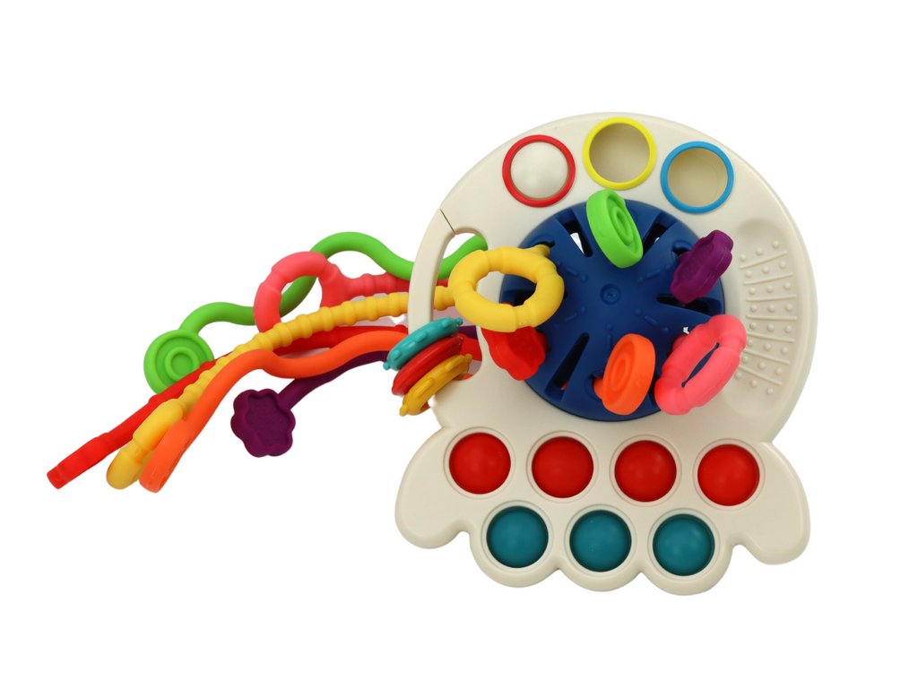 Smyslová chobotnice je mimořádná interaktivní hračka, která fascinujícím způsobem rozvíjí smysly a motoriku dítěte. Poskytuje rozmanitou zábavu a umožňuje vašemu dítěti nejen si užít tahání barevných nití z jednoho konce na druhý, ale také prozkoumat praskající bubliny a pohyblivé korálky.