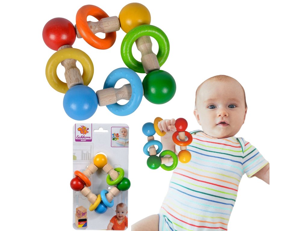 Dřevěný drapák je mimořádně barevný!Dílky jsou spojeny pružnou gumičkou. Dvě ze čtyř obručí jsou měkké kousací obruče.