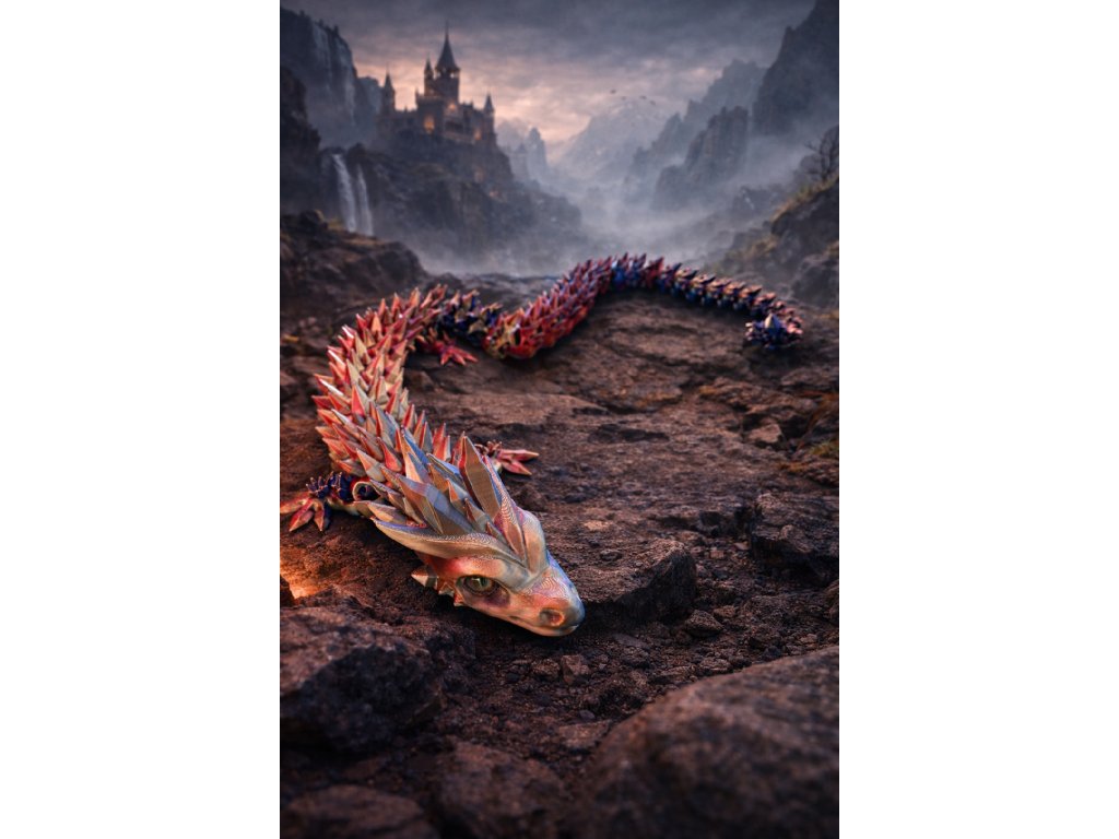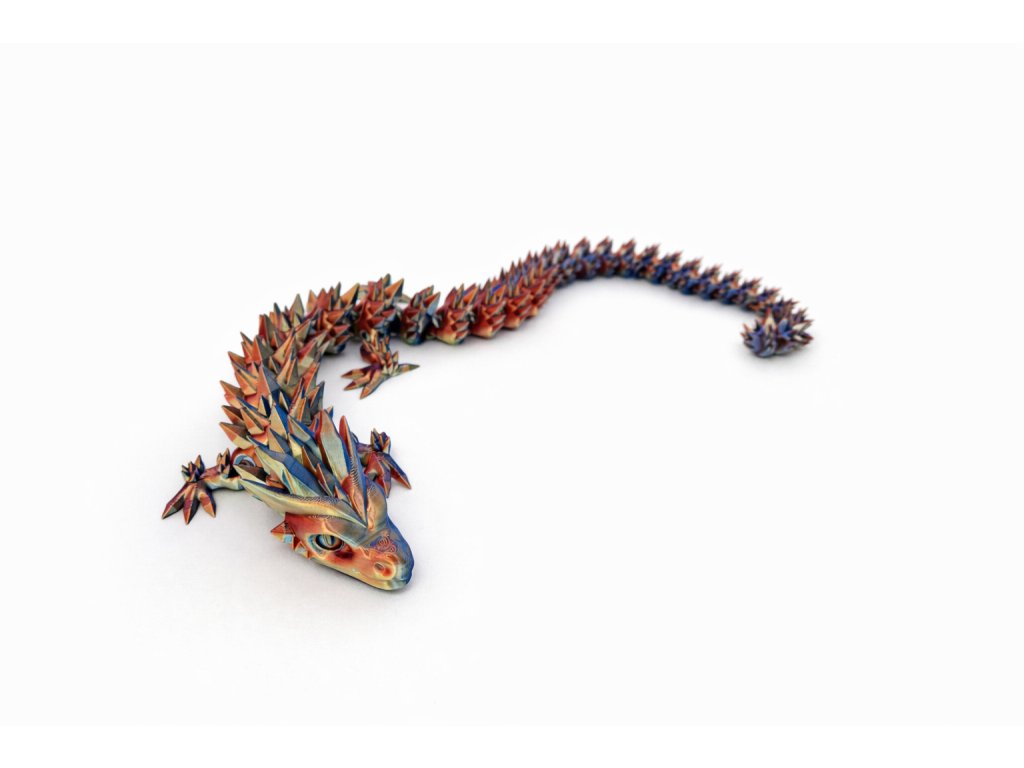 Tento originální drak vyrobený pomocí 3D tisku zaujme na první pohled svým jedinečným vzhledem a plynulými barevnými přechody. Je vytištěn z kvalitního PLA filamentu v atraktivní variantě Tri Color Sunset Horizon, která kombinuje teplé odstíny připomínající západ slunce.