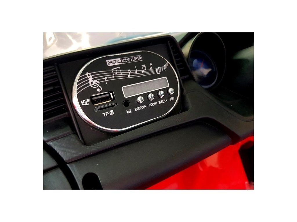 Přístrojová deska je plná světel, což zvyšuje pocit, že vaše dítě řídí skutečné auto. Najdete zde imitaci tachometru a otáčkoměru a také hudební panel, který umí přehrávat hudební soubory MP3.