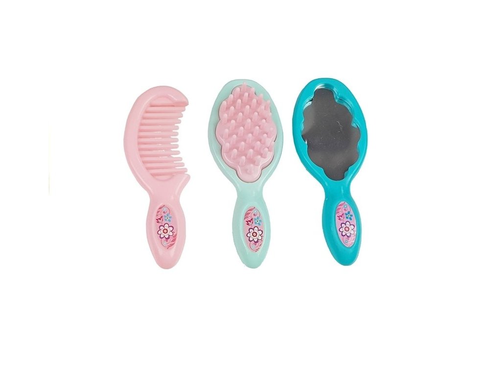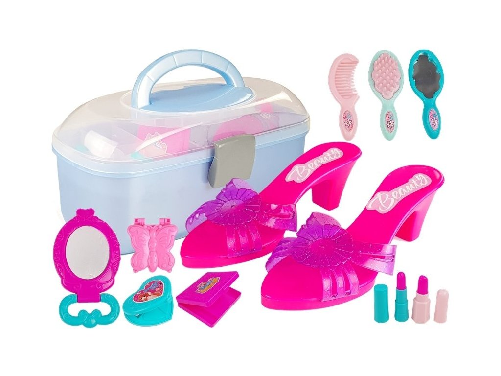 Sada upoutá dívčí oči a vybízí je ke hře. Co zajímavého najdou uvnitř? Vysoušeč vlasů, který se podobá skutečnému, a také malé praktické zrcátko v oválném tvaru. Důležitou součástí kompletu jsou žabky na nízkém podpatku, které princezny milují nejvíce. Celá řada vlasových doplňků jako kartáč, válečky a hřeben vybízí k vytváření různých účesů a do krabiček ve tvaru motýla si budete moci zabalit šperky z korálků, které jsou rovněž součástí sady. Dalšími prvky jsou imitace dvou růžových rtěnek.