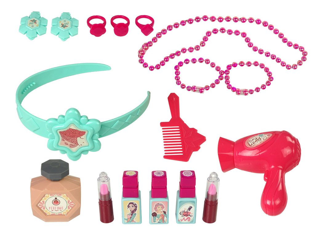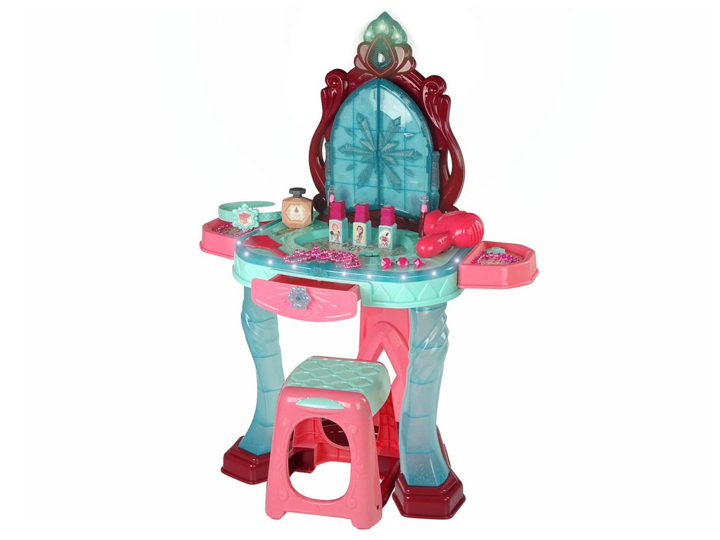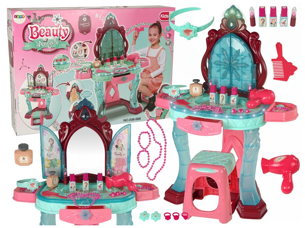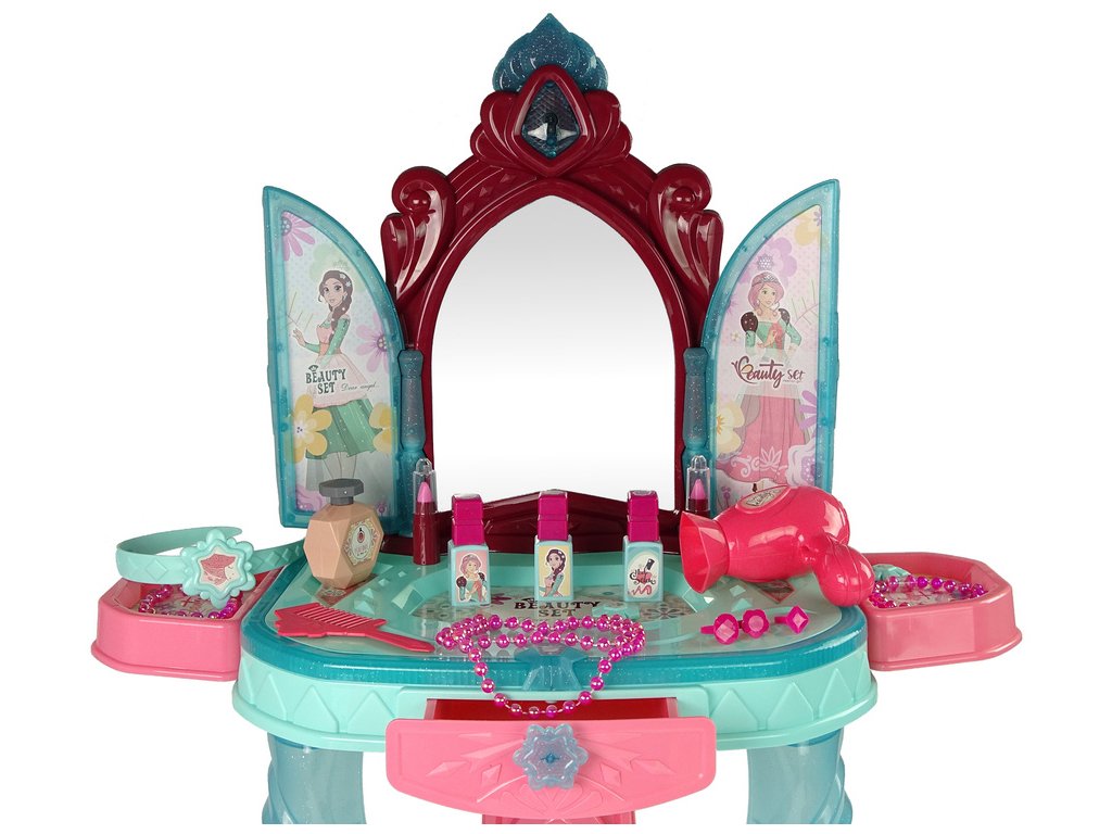 Tato kosmetická sada je krásný dětský toaletní stolek v dívčích barvách. Je vybavena zásuvkou na šperky a velkým zrcadlem ve třech částech. Na bočních dílech jsou obrázky princezen. Nyní se princeznou může stát i vaše holčička.