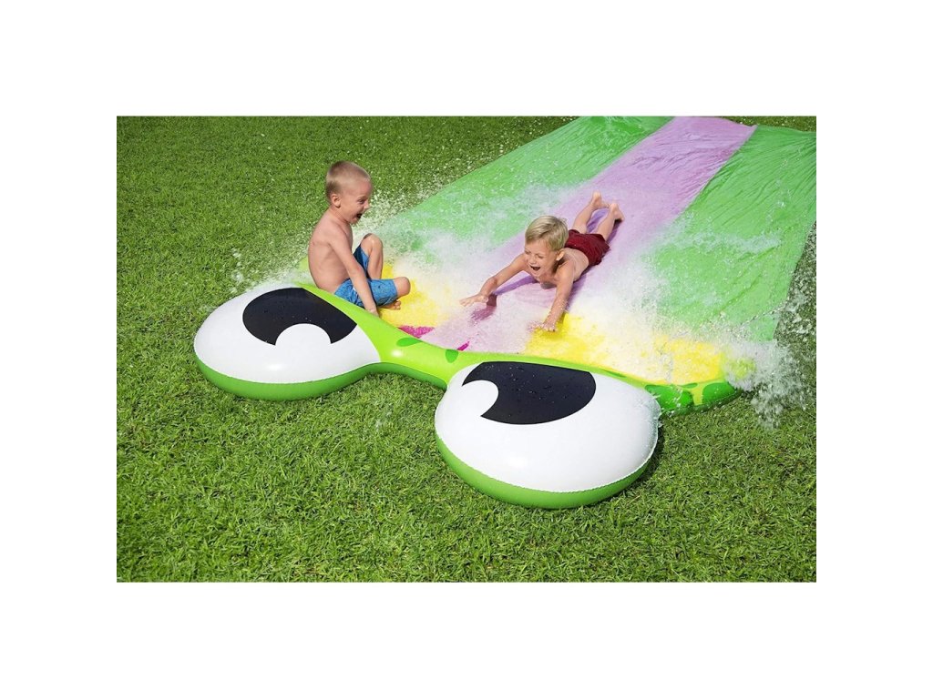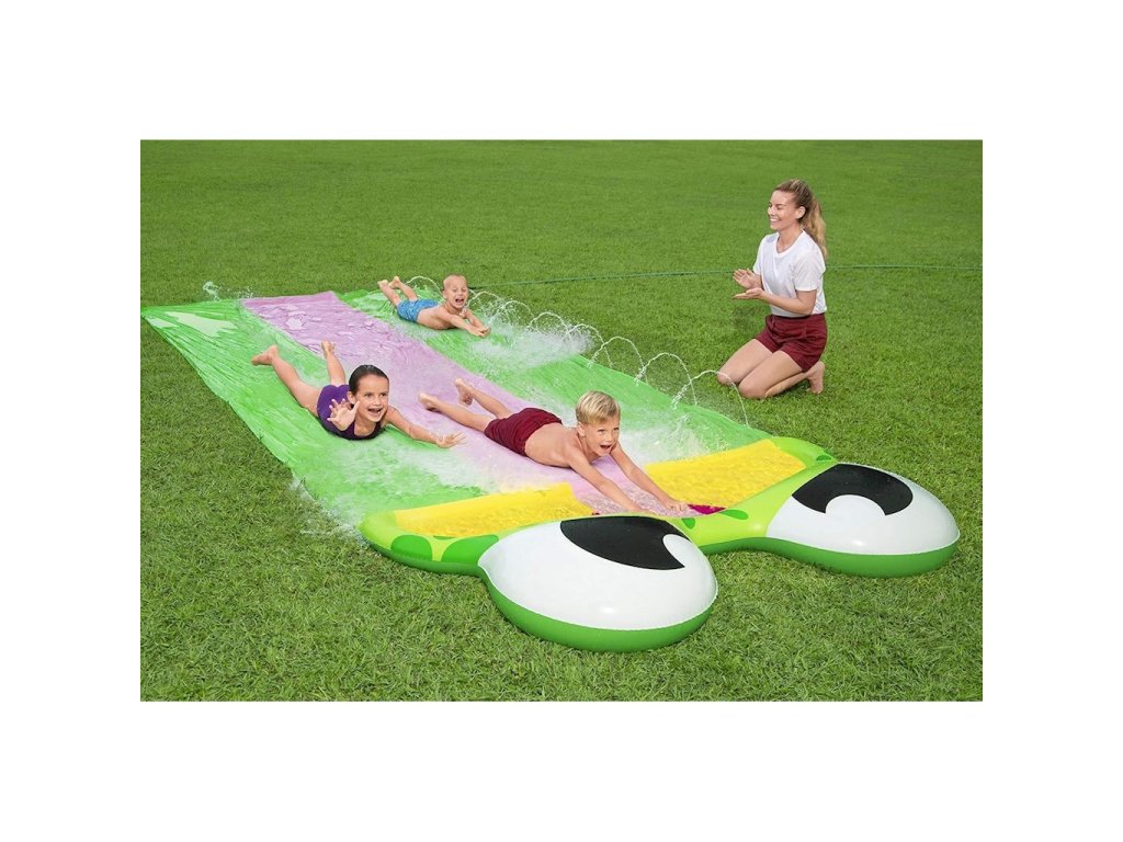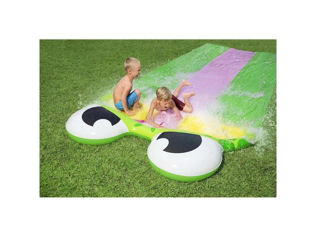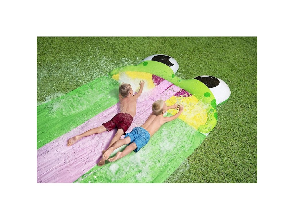 Bestway Friendly Frog Slide Water Slide Frog 52389H2Ogo! Friendly Frog Slide umožňuje dětem skočit do zábavy a sklouznout po žabím jazyku. Je to perfektní způsob, jak dostat své děti z gauče na slunce! Tato skluzavka je 15 stop dlouhá, poskytuje dětem dostatek prostoru pro cákání a klouzání. Navíc s několika drahami je jako stvořený pro závodění a společné hraní. Tři děti mohou jít dolů najednou, takže je to zábavná soutěž, která je udrží aktivní a zabaví na celé hodiny. Stačí připojit zahradní hadici, naplnit základnu vodou pro stabilitu a můžete vyrazit!