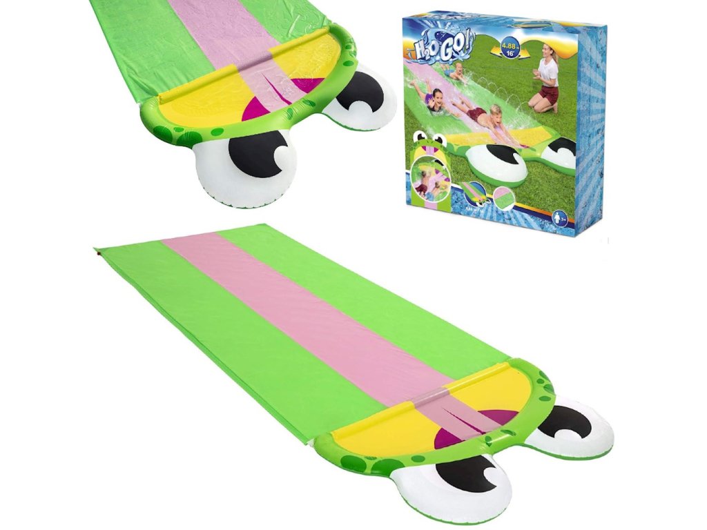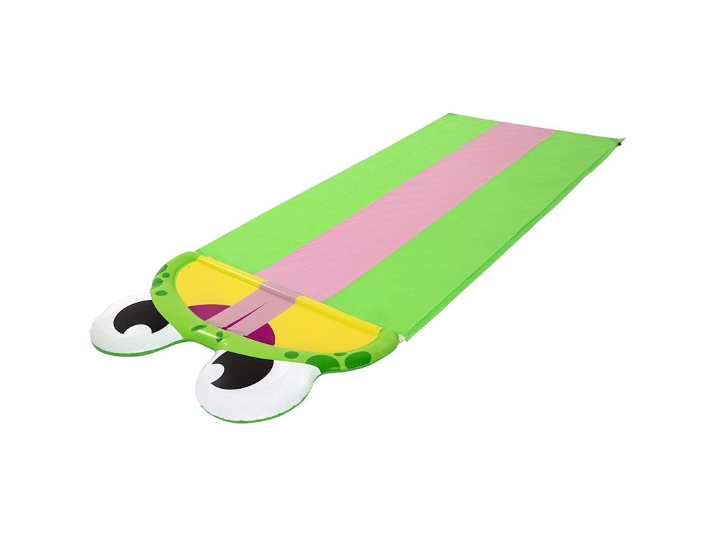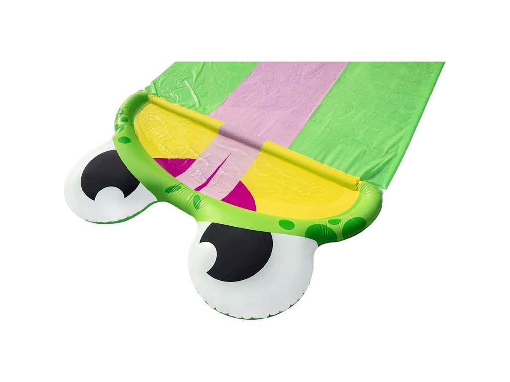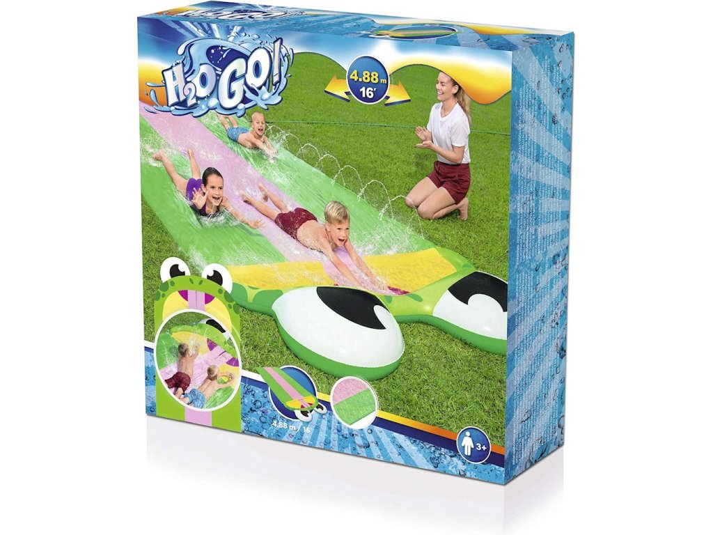 Bestway Friendly Frog Slide Water Slide Frog 52389H2Ogo! Friendly Frog Slide umožňuje dětem skočit do zábavy a sklouznout po žabím jazyku. Je to perfektní způsob, jak dostat své děti z gauče na slunce! Tato skluzavka je 15 stop dlouhá, poskytuje dětem dostatek prostoru pro cákání a klouzání. Navíc s několika drahami je jako stvořený pro závodění a společné hraní. Tři děti mohou jít dolů najednou, takže je to zábavná soutěž, která je udrží aktivní a zabaví na celé hodiny. Stačí připojit zahradní hadici, naplnit základnu vodou pro stabilitu a můžete vyrazit!
