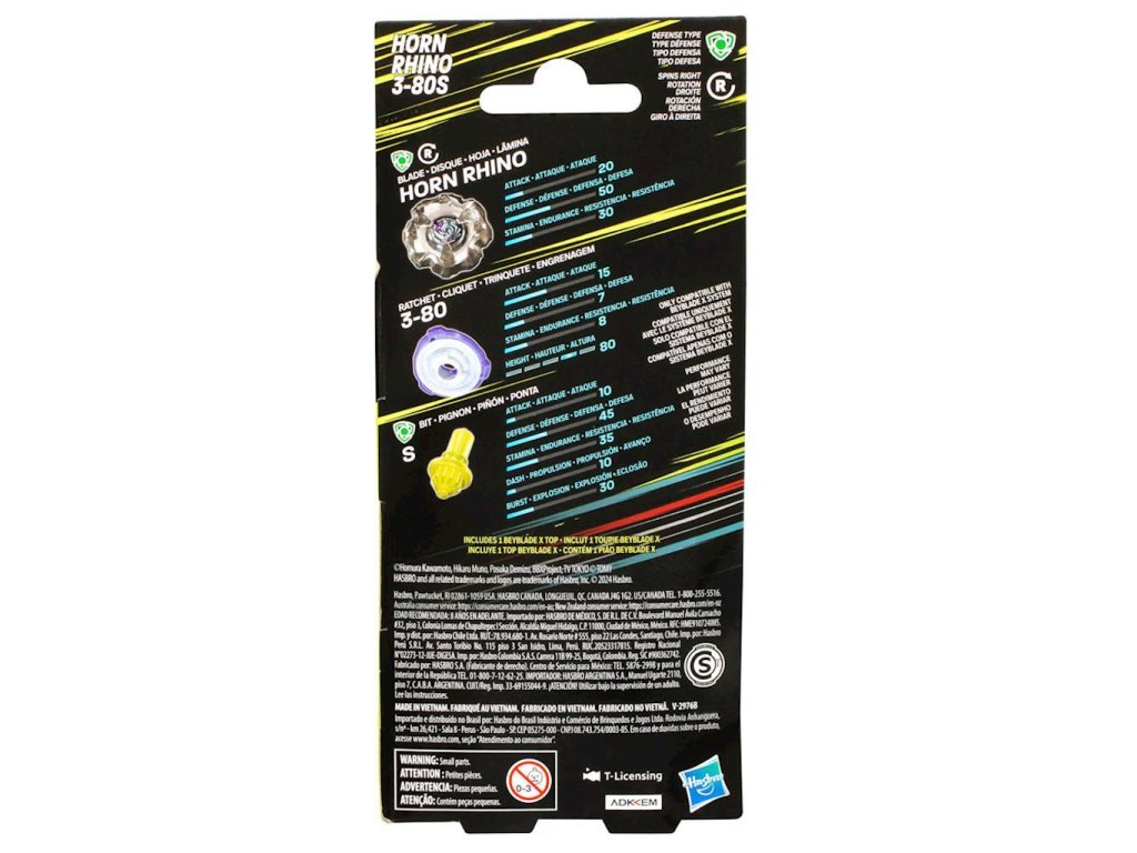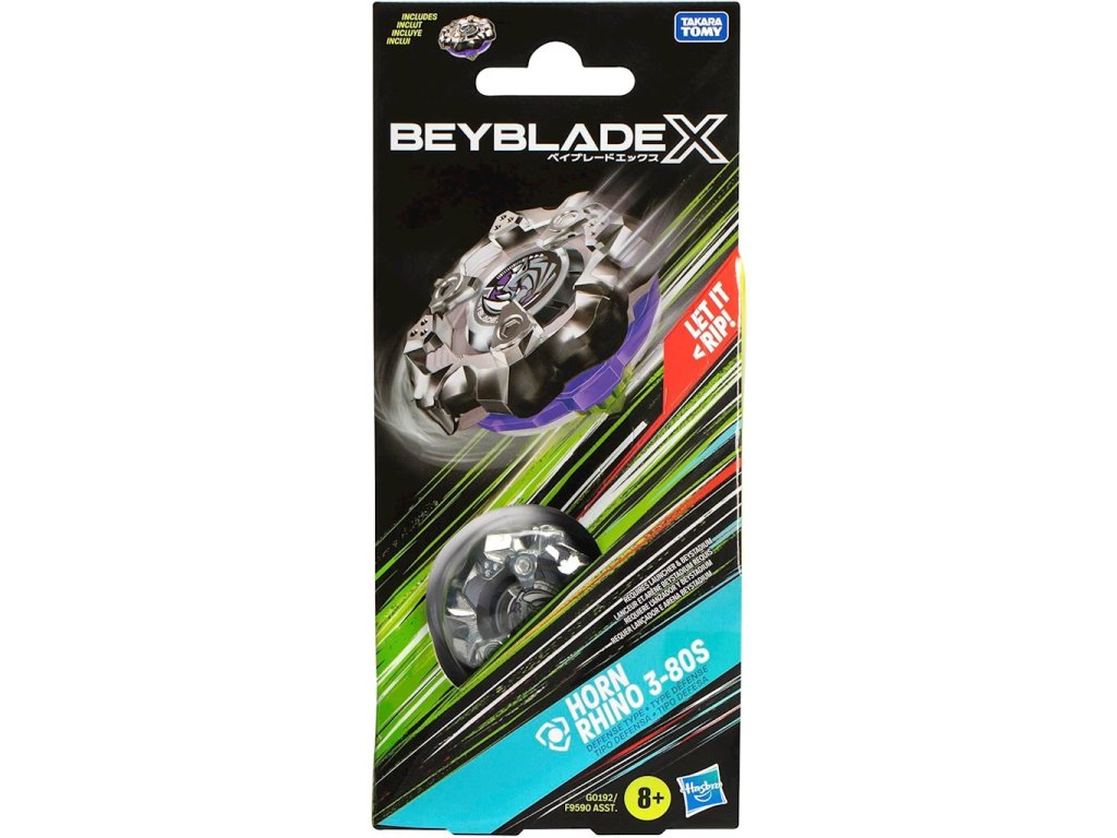 Beyblade X Single Spinning Top Horn Rhino 3-80S G0192Xtreme Dash , což vede k dynamickým kolizím a velkolepým explozím. Sada obsahuje vyměnitelné prvky (čepel, západka, udidlo), které lze kombinovat s dalšími kolovršky Beyblade X. Cílem hry je získat 4 body.