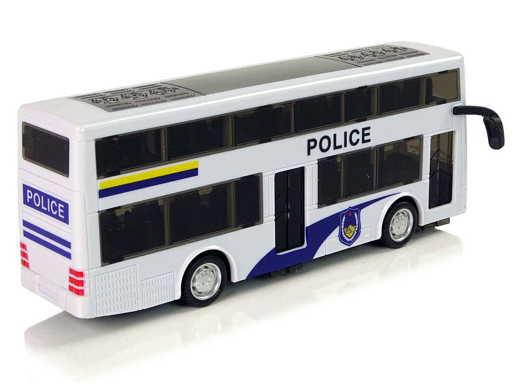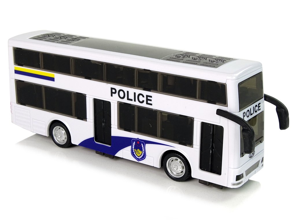 Bílý dvoupatrový policejní autobus se zvukem stahování
