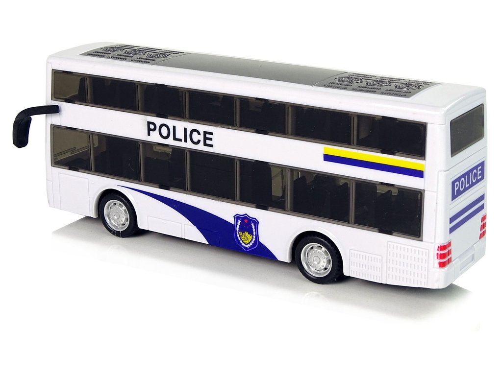 Krabička, ve které je zabalena, bude na poličce vypadat pěkně. Autobus má zpětný pohon a je vyroben z plastu s pryžovými pneumatikami. Interiér vozu má reprodukován každý detail, který bude připomínat jeho skutečný protějšek. Na bocích bílého vozu jsou modré vzory, nápis POLICIE a charakteristické polepy. Hračka ve vašem dítěti vzbudí velkou zvědavost a určitě se jedno z těchto autíček zařadí do jeho sbírky.