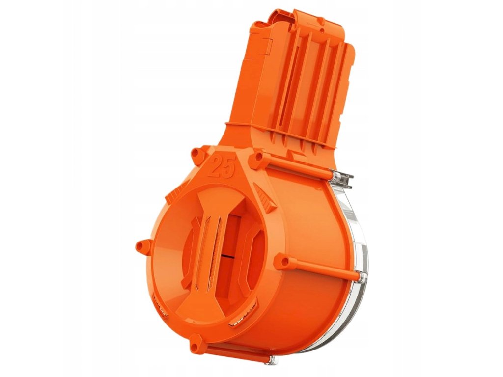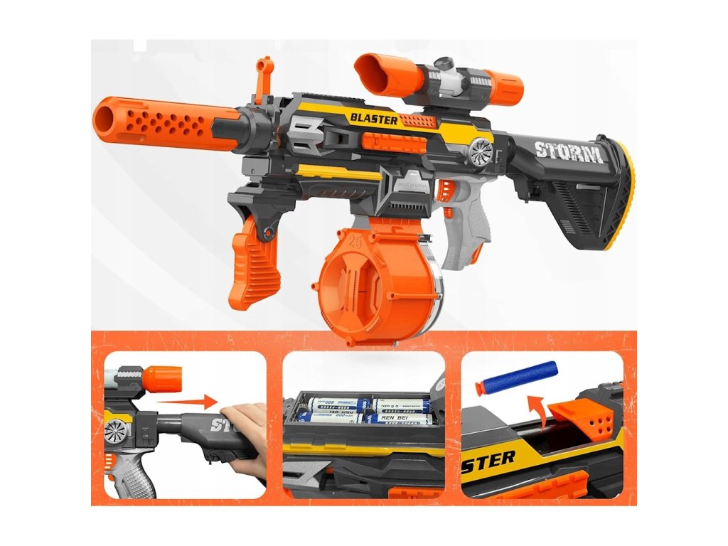 • puška má prostorný bubnový zásobník na 25 šipek, což zajišťuje delší zábavu bez nutnosti častého nastavování, včetně zaměřovače, ergonomický design