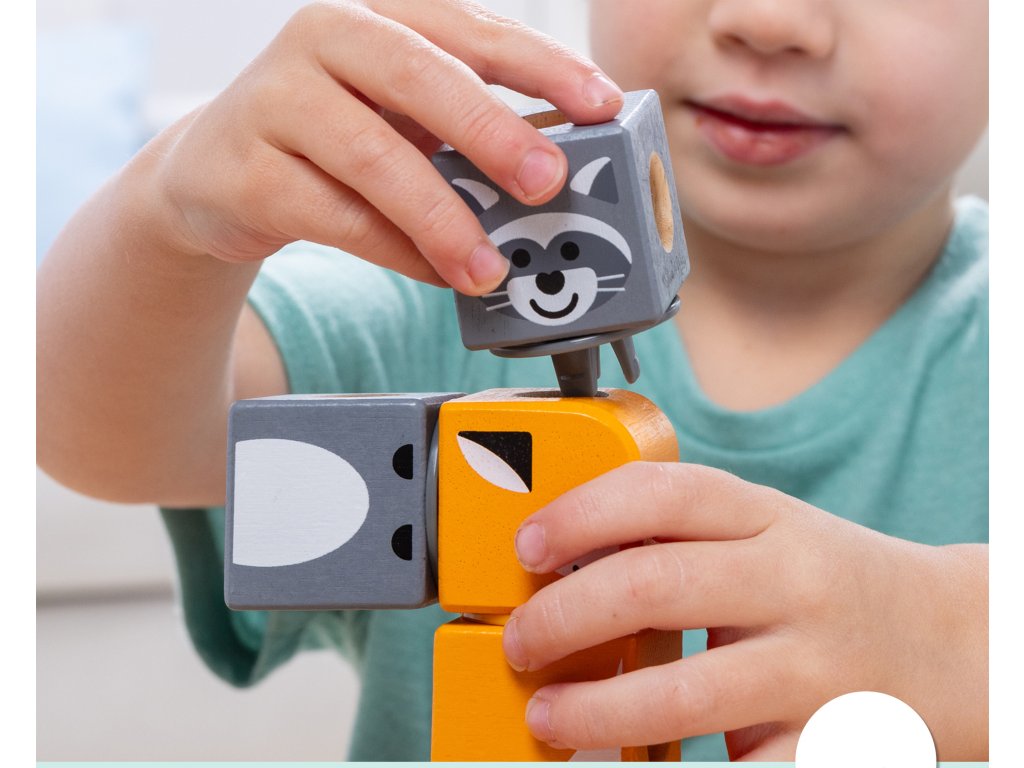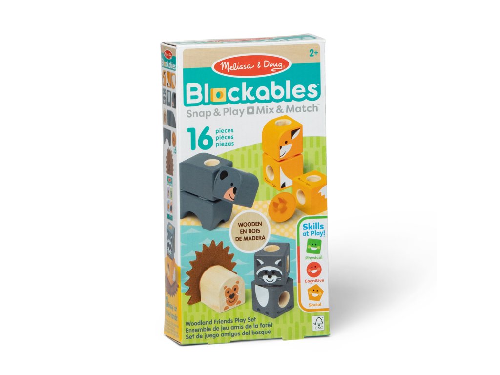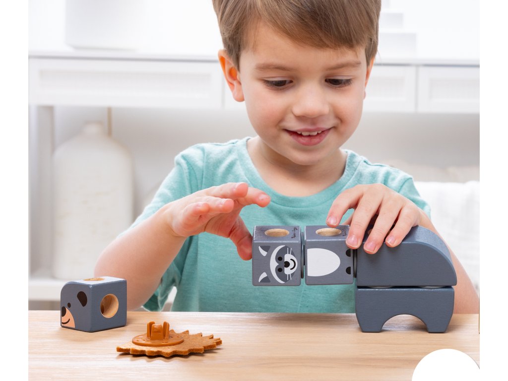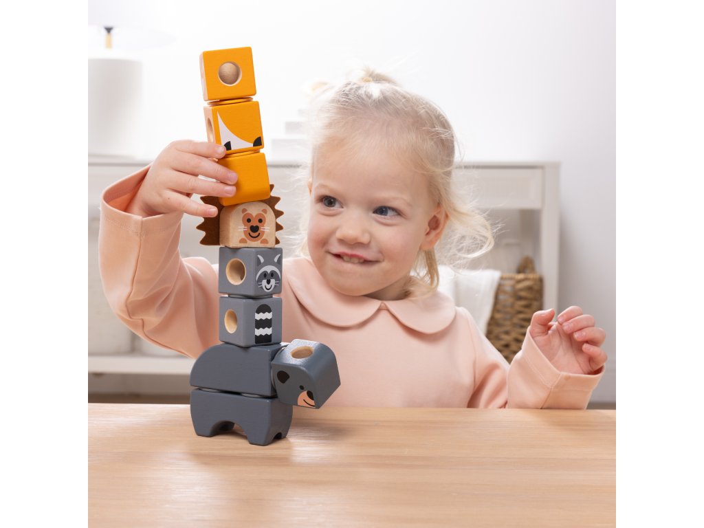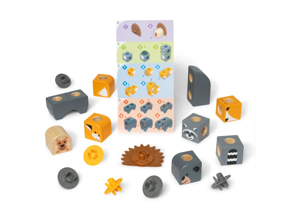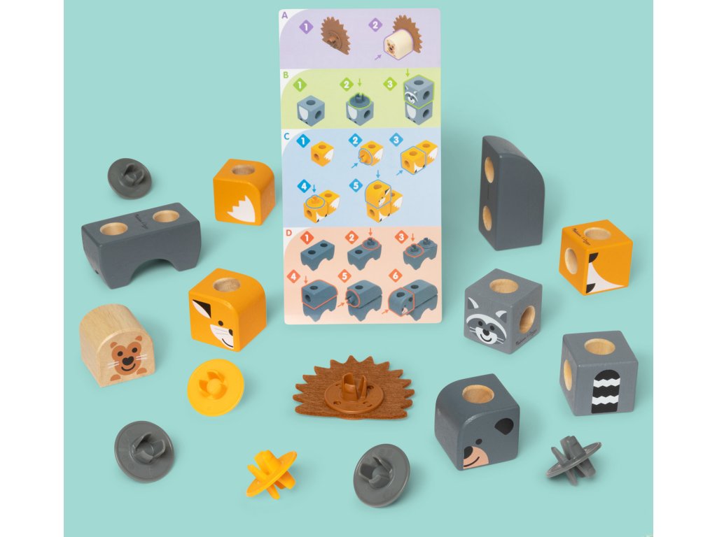 Sada se skládá z 16 dřevěných dílků, snadno uchopitelných a perfektních do dětských rukou. Součástí kontejneru jsou mimo jiné postavičky s lesními vzory a zvířátka . Po naskládání na sebe bloky rozvíjejí koordinaci očí a rukou a motorické dovednosti, stimulují smysly a poskytují dlouhotrvající zábavu. Bloky jsou vyrobeny z FSC certifikovaného dřeva.