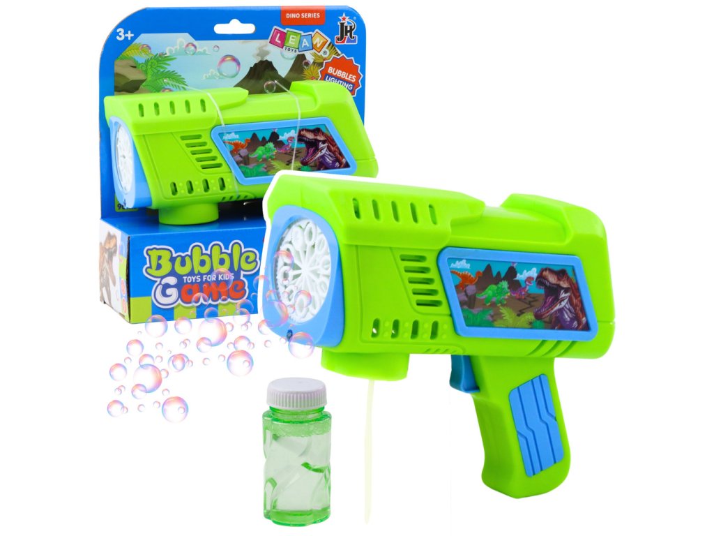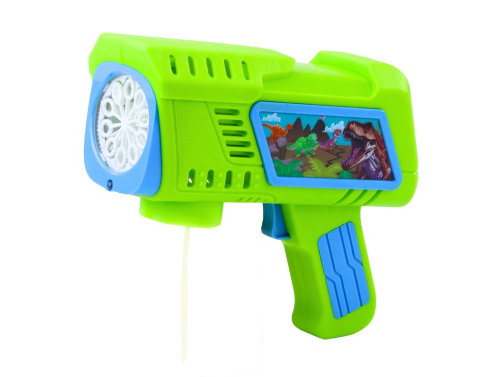 Zelená bublinková pistole je hračka, která zaručuje skvělou zábavu a barevné chvíle pro nejmenší. Vybavený ozdobným motivem dinosaura a jednou vestavěnou LED diodou vytváří nejen spoustu bublinek, ale přitahuje pozornost i jemným osvětlením.