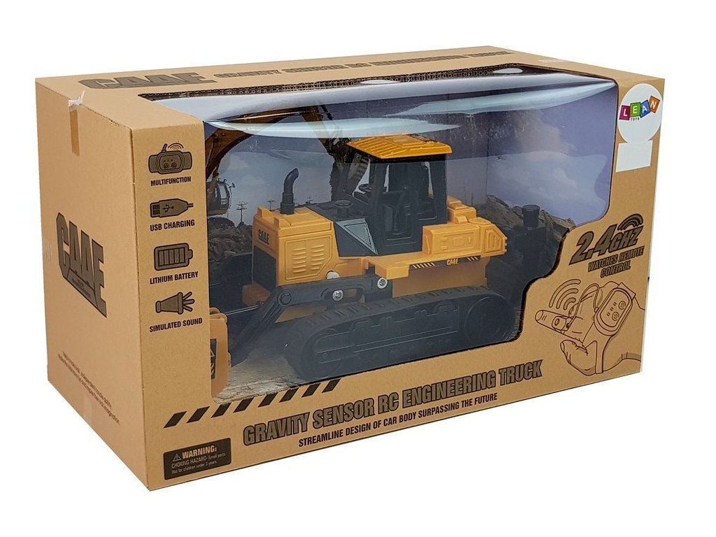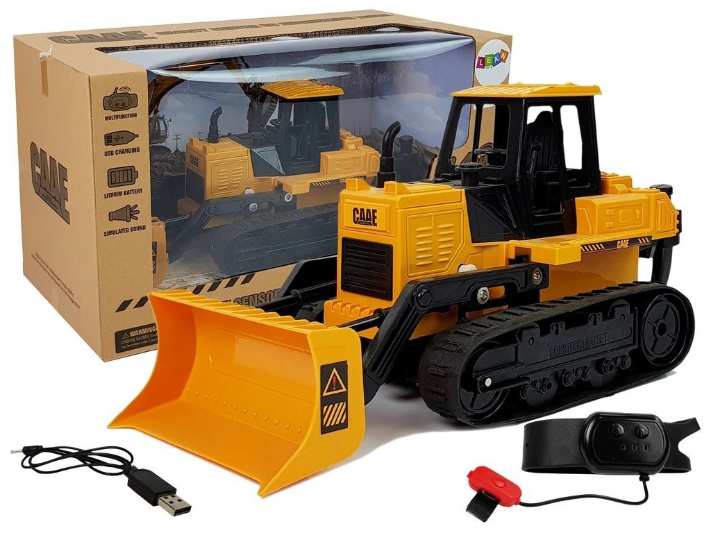 Nejlepší předností tohoto produktu je ovládání tohoto buldozeru gesty rukou! Pásek na ruku, který je součástí sady, ovládá celé vozidlo. Nasaďte si ho na dlaň a ukazováček a všechny vaše pohyby se zopakují na stavebním vozidle.