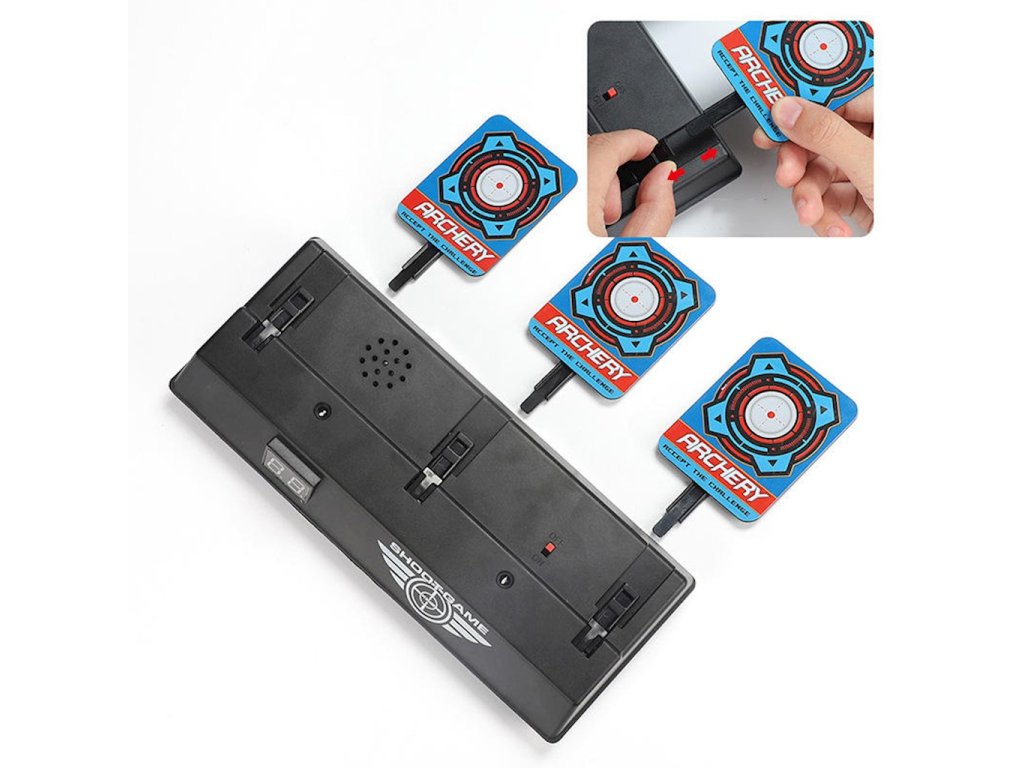 Nyní získáte elektronický terč Nerf, který odpočítává body v sadě s odpalovačem. Terč se skládá ze základny a tří pohyblivých cílů. Každý cíl se po zásahu položí zpět. Po sestřelení tří cílů získáte jeden bod a všechny cíle se automaticky zvednou. Terč má světelné a zvukové efekty. Svolejte kamarády, nabijte odpalovací zařízení a vyzkoušejte svou přesnost!