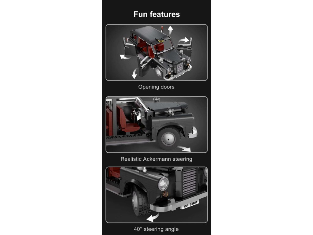 Sada obsahuje 1871 dílků a umožňuje vám, abyste si sami sestavili úžasnou repliku ikonického vozidla. Vozidlo bylo vytvořeno s mimořádným důrazem na detail, který zajistí neuvěřitelnou zábavu. Vozidlo má otevírací dveře, pohyblivá, otočná přední kola a pohyblivý volant. Navíc k němu lze dokoupit sadu na dálkové ovládání (není součástí balení).