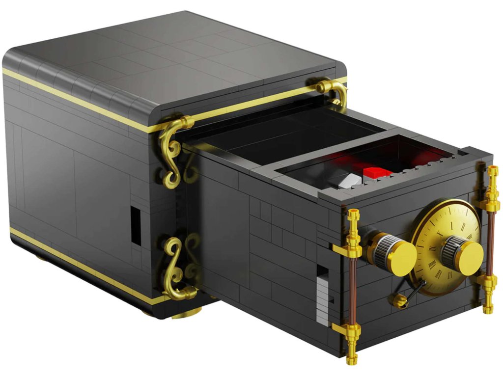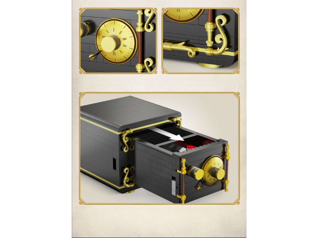 Sada se skládá z 442 dílků a umožňuje vám sestavit si trezor sami.Zařízení bylo vytvořeno s zvláštním důrazem na detail, který vám poskytne úžasnou zábavu. Je vybaveno skutečným šifrovacím mechanismem. Keš je vyrobena v moderním stylu, má černou barvu se zlatými prvky a dva knoflíky, které jsou zodpovědné za šifrování zařízení. Na hlavním knoflíku jsou římské číslice, které vám pomohou uhodnout šifru. Sada byla zabalena do elegantního obalu, takže hračka je ideální jako dárek.