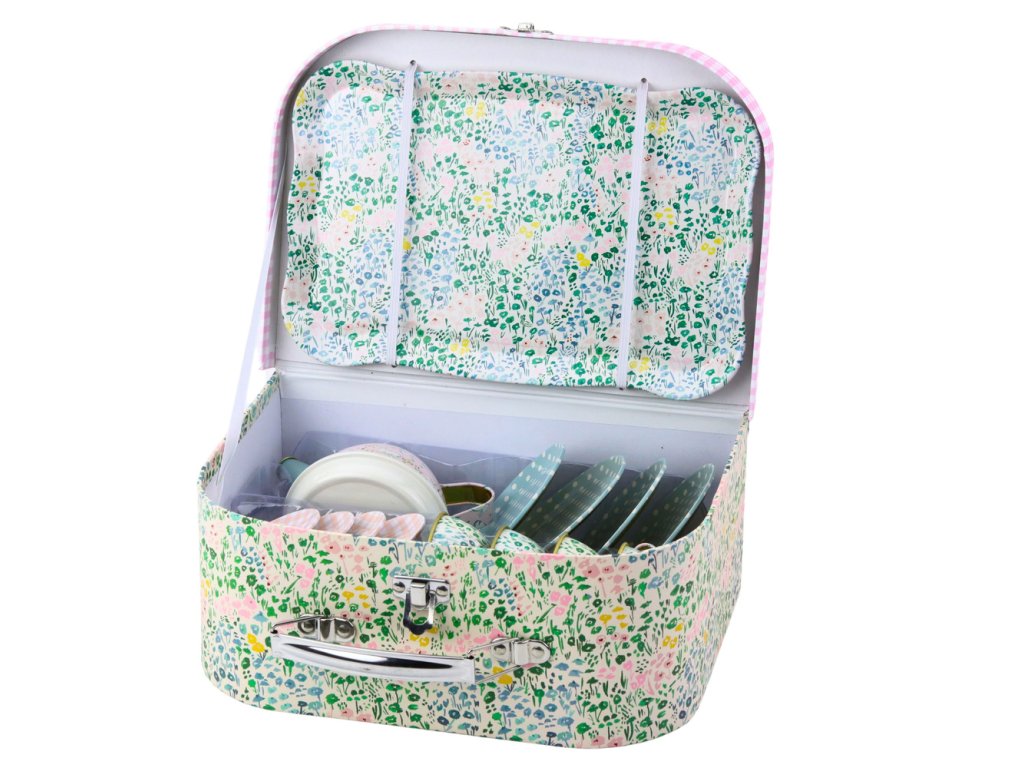 Celé je to zabaleno v elegantní krabičce v retro stylu, vyrobené z tvrdého kartonu s kovovými prvky, s květinovým a kostkovaným vzorem. Box má pohodlnou rukojeť a sponu, takže si jej snadno vezmete na piknik, procházku nebo na zahradu. Je to hračka nejen krásná, ale i funkční, která se hodí i jako dárek - pro holčičky i kluky, kteří mají rádi kreativní hru.