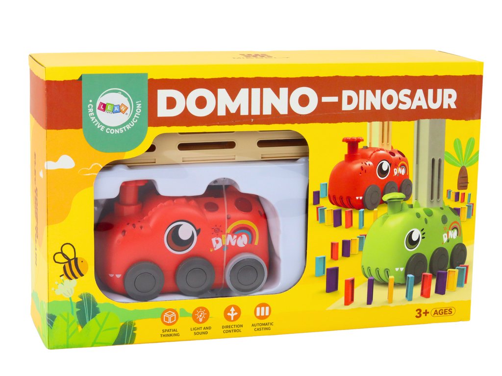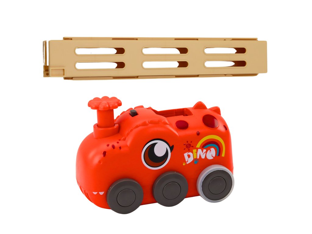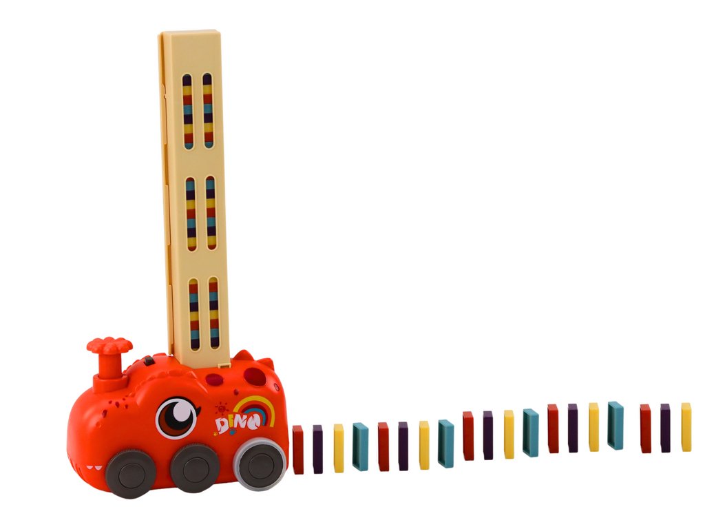 Zde je červené dinosauří auto na baterie, které se nejen pohybuje, ale také vám pomůže postavit fantastické domino trasy!