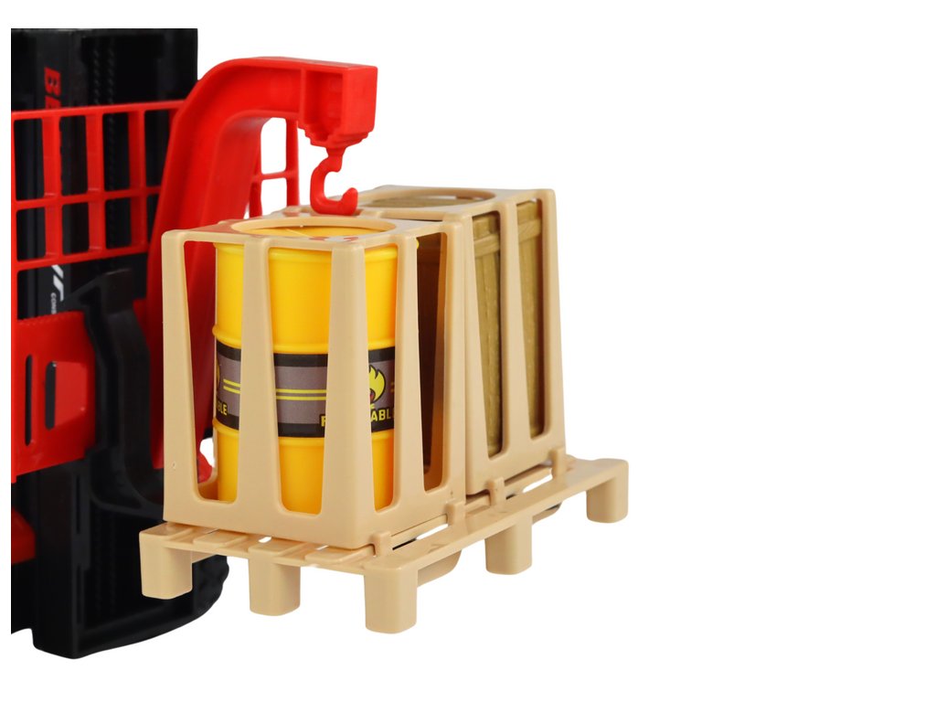 S pohyblivými vidličkami, ovládanými přesným knoflíkem, může dítě snadno zvedat a spouštět břemena a rozvíjet tak své manuální dovednosti a koordinaci ruka-oko. Sada obsahuje paletu se sudem a přepravku, která přidává ještě více herních možností a scénářů.