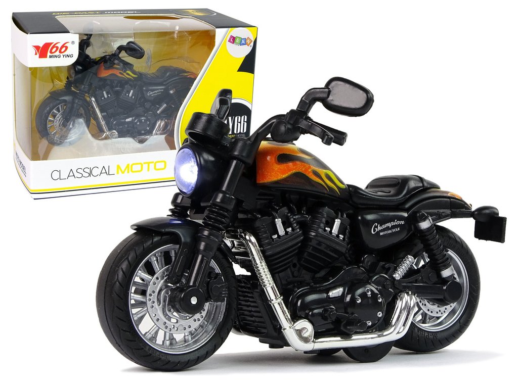 Vzhled motorky je propracován do nejmenších detailů. Má všechny plastové díly s výraznými polepy a gumovými kolečky, které zaručují přilnavost k zemi. Stahovací pohon umožňuje neuvěřitelnou zábavu. Stačí motorku zatáhnout a pustit, uvidíte, jak klouže po prostoru vašeho pokoje. Výhodou tohoto modelu jsou světelné a zvukové efekty, přitlačením vozidla k zemi se aktivují přední světla pro osvětlení vozovky a klakson a zvuky motoru za jízdy.