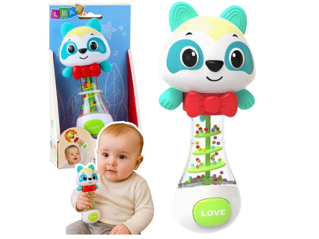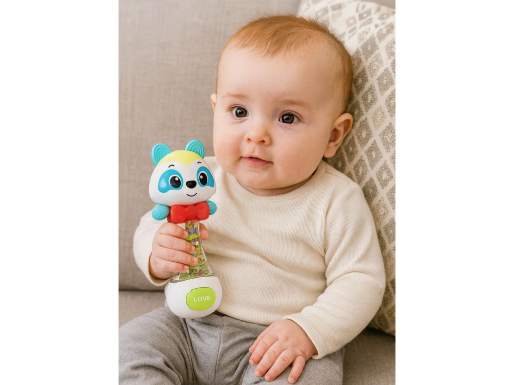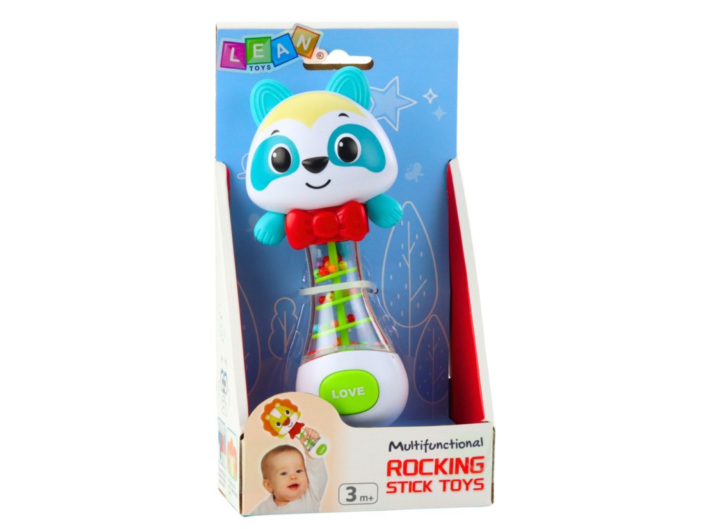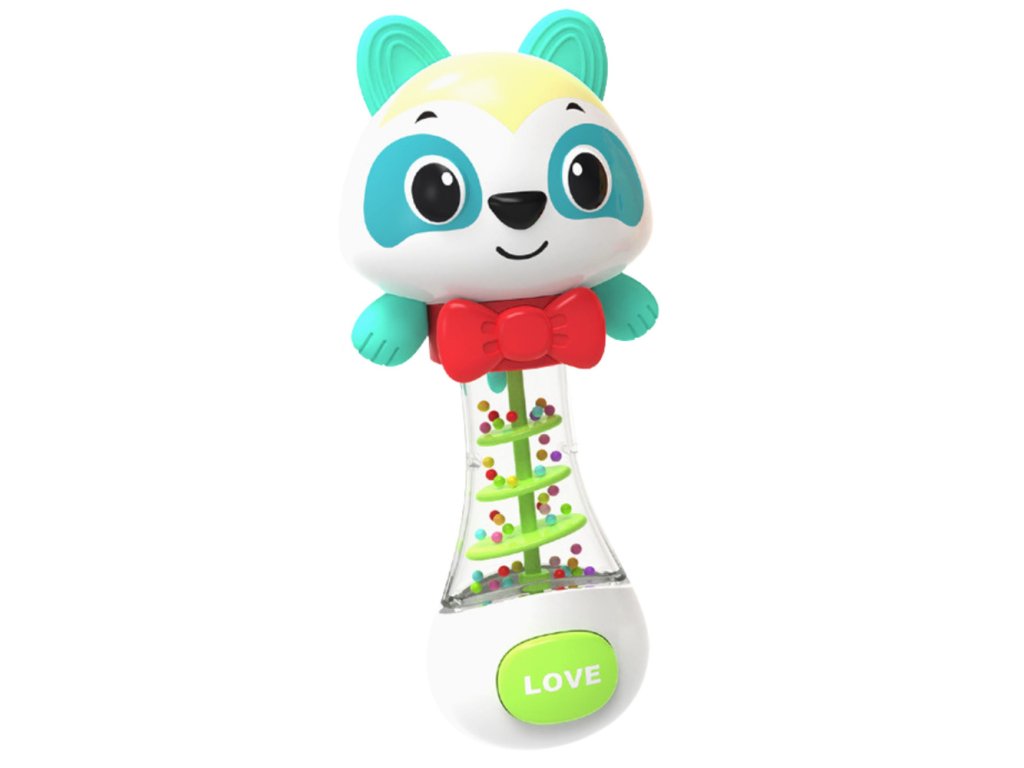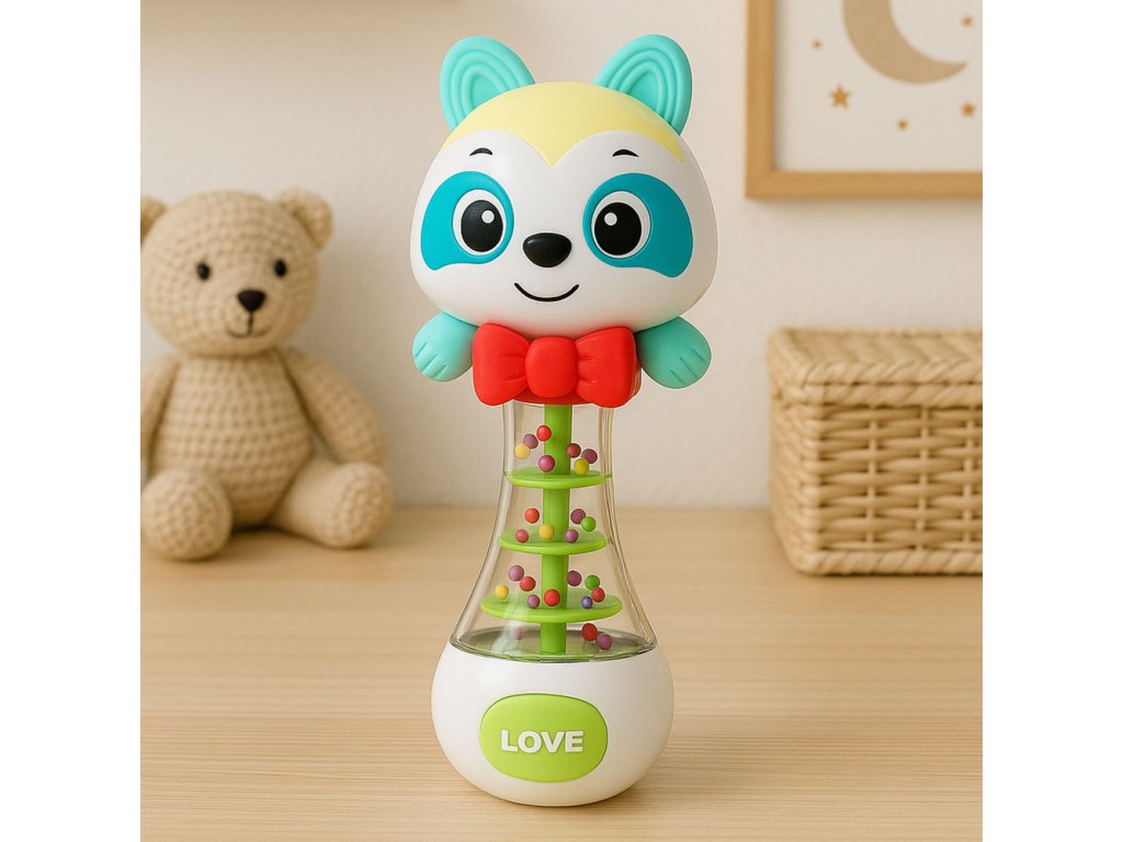 Chrastítko s medvídkem je barevná, bezpečná a funkční hračka určená pro miminka od 3 měsíců. Jeho přátelský vzhled, jemný úsměv a zářivé barvy okamžitě upoutají pozornost dítěte a povzbuzují k aktivní hře. Uvnitř průhledné části hračky jsou barevné kuličky, které při zatřesení vydávají jemný, příjemný zvuk. To nejen baví, ale také pozitivně ovlivňuje smyslový vývoj dítěte.