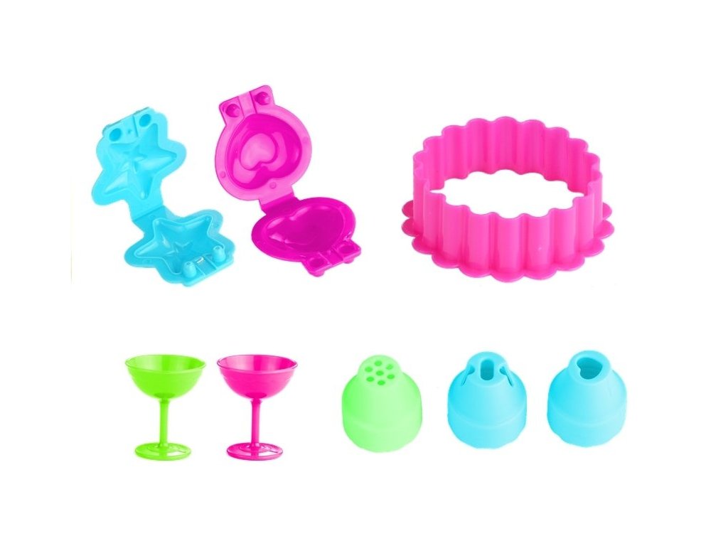 Chcete-li rozšířit škálu barev o další odstíny, stačí se podívat na cheat sheet na obalu balíčku. Kombinace červené a modré modelovací hmoty přechází v růžovou hmotu, zatímco žlutá a červená: v oranžovou barvu. Kombinujte podle libosti, bude to skvělá zábava! Příslušenství obsažené v sadě, jako jsou odšťavňovače, talíře a příbory, jsou vyrobeny z certifikovaného plastu, bezpečného pro děti. Jejich rozměry jsou přizpůsobeny dětským ručkám, což je zodpovědné za pohodlí při hře. Množství prvků obsažených v sadě vám umožní bavit se mnoha způsoby - zdobení dortu nikdy nebylo tak zábavné - přesvědčte se sami.