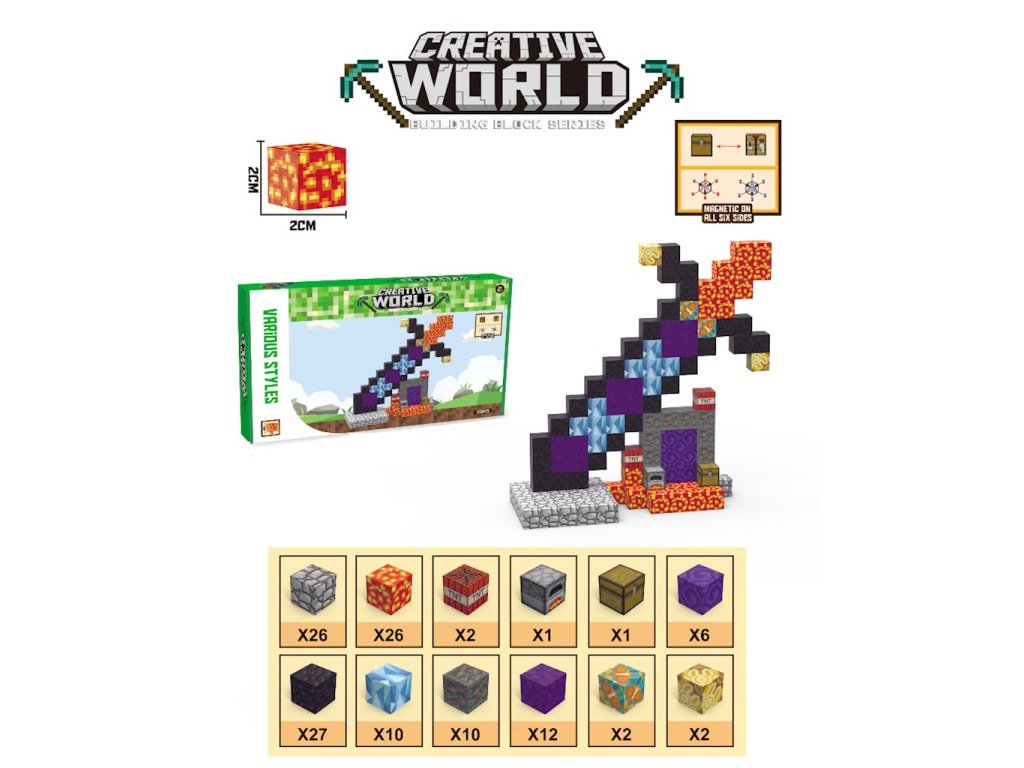 Sada magnetických bloků Creative World Meč a portál 125 dílků JM819Vstupte do světa kreativní hry se sadou Creative World – Meč a portál, která přenese vaše dítě přímo do pixelového dobrodružství inspirovaného Minecraftem! Tato sada je ideální pro malé fanoušky stavění, objevování a vytváření vlastních příběhů. Díky magnetickým blokům, které se spojují ze všech stran, je stavění ještě jednodušší, stabilnější a uspokojivější.