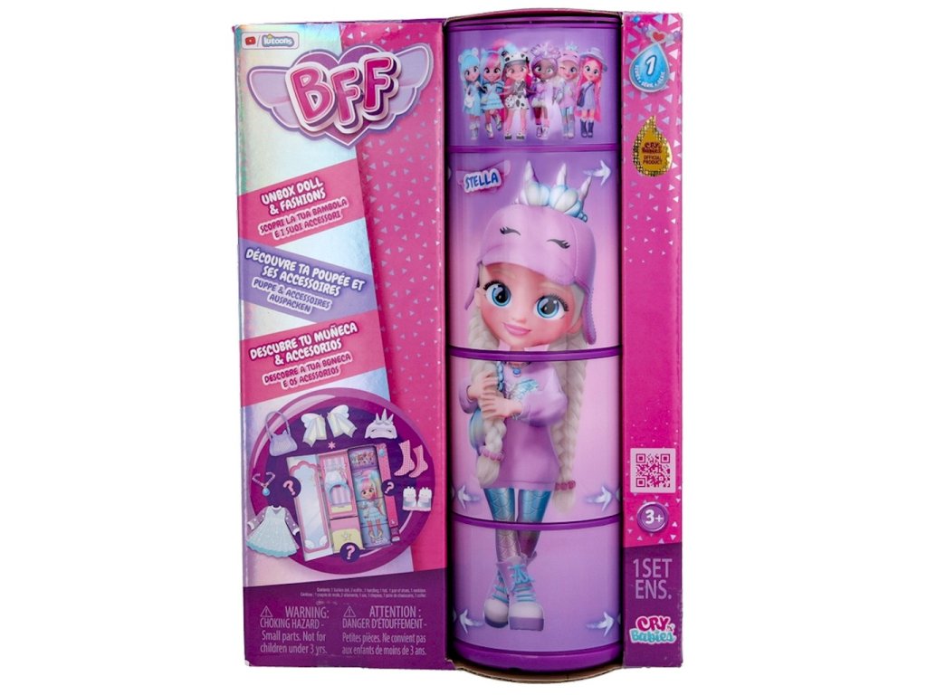 Nasbírejte celou kolekci jedinečných panenek Cry Babies BFF! Vašim oblíbeným hrdinkám je nyní 13 let a jsou připraveny na nová dobrodružství a styling. V této kolekci najdeš šest módních kamarádek, z nichž každá je oblečena v jedinečném stylu plném detailů a v souladu s nejnovějšími trendy. Každá panenka je zabalena v jedinečné krabici, která je zároveň jejich šatníkem!Stella má krásné dlouhé blond vlasy, je upravená do dvou copánků, má velké oči a je plně pohyblivá. Je oblečena do módního oblečení - legín s kovovými akcenty, růžové oversize mikiny s motivem srdce a vysokých sportovních bot! Přidej k ní kabelku ve tvaru srdce, baseballovou čepici inspirovanou narvalem a odpovídající náhrdelník BFF!